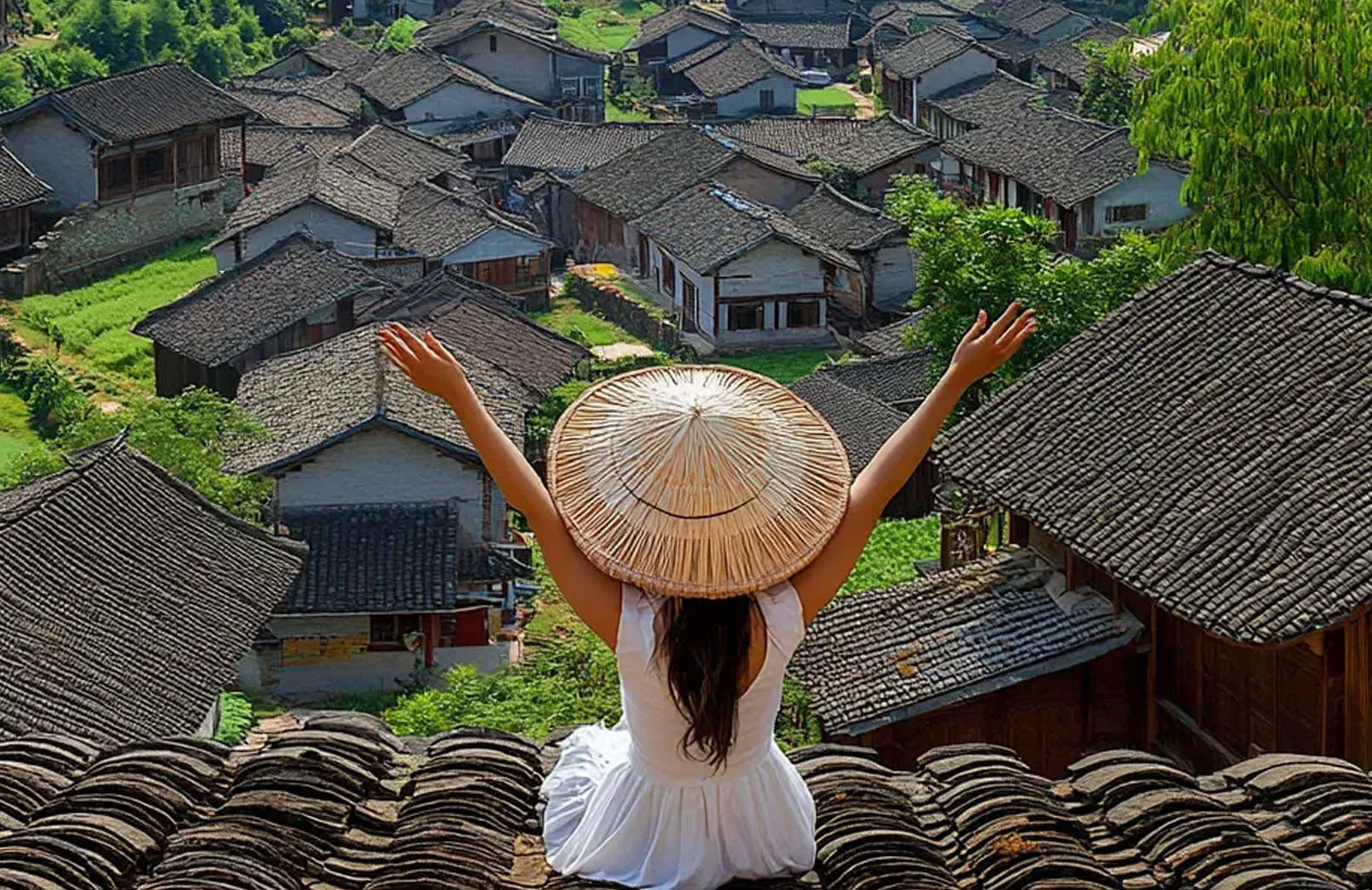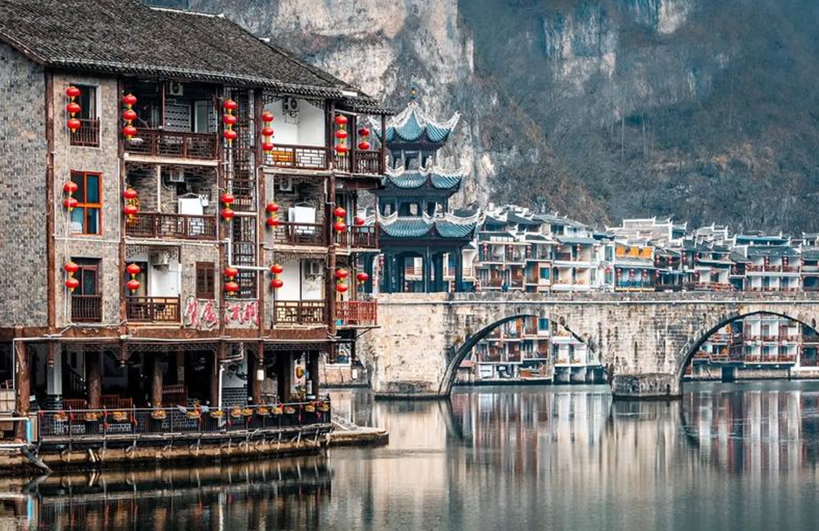 이곳은 사방이 산으로 둘러싸여 있고, 겹겹이 솟은 산봉우리, 계단식 논이 산을 따라 구름까지 이어져 있으며, 바이수이 강이 마을을 가로질러 시장 먀오족 마을을 둘로 나눕니다.