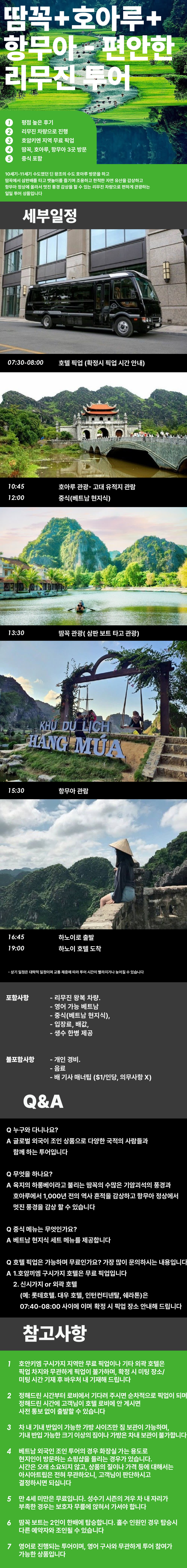 10~11세기 수도였던 딘 왕조의 수도 호아루 방문을 하고 땀꼭에서 삼판배를 타고 뱃놀이를 즐기며 조용하고 한적한 자연 유산을 감상하고 항무아 정상에 올라서 멋진 풍경 감상을 할 수 있는 리무진 차량으로 편하게 관광하는 일일 투어 상품입니다!