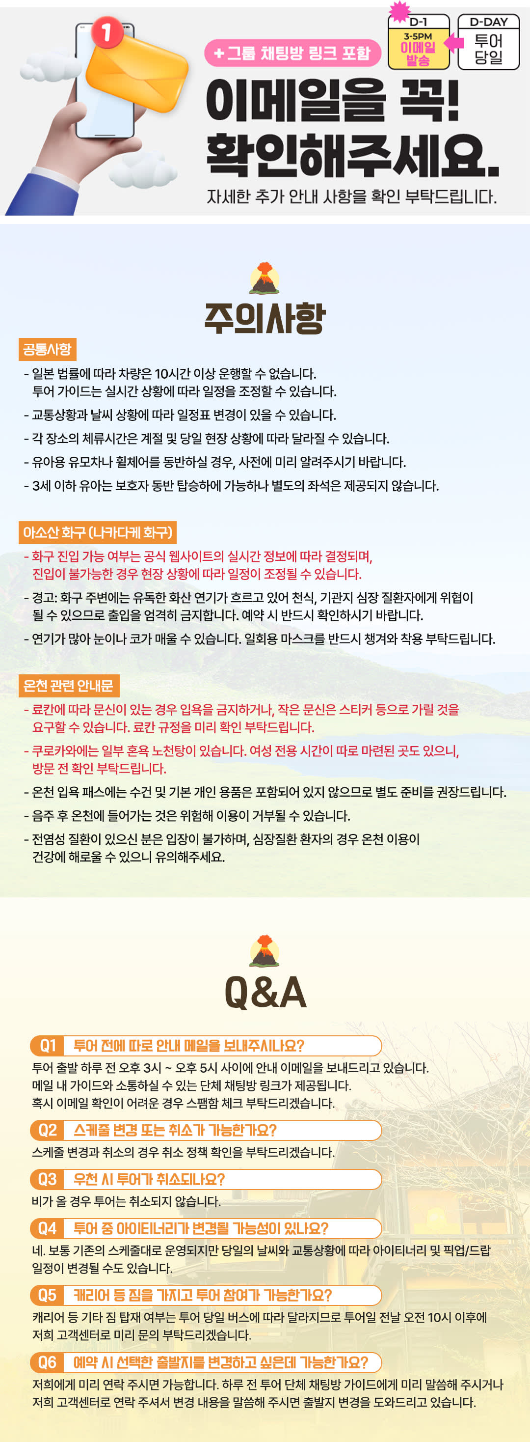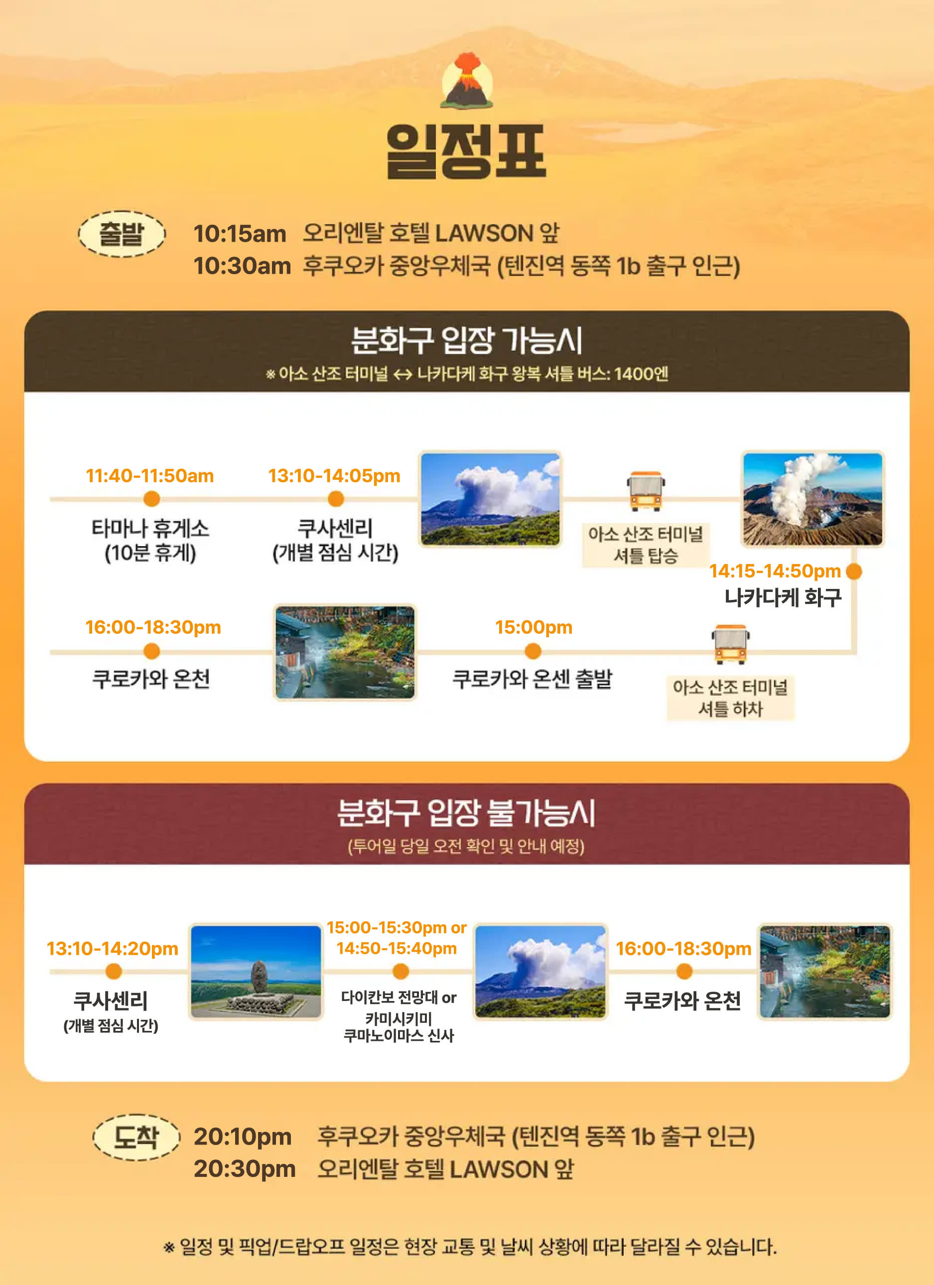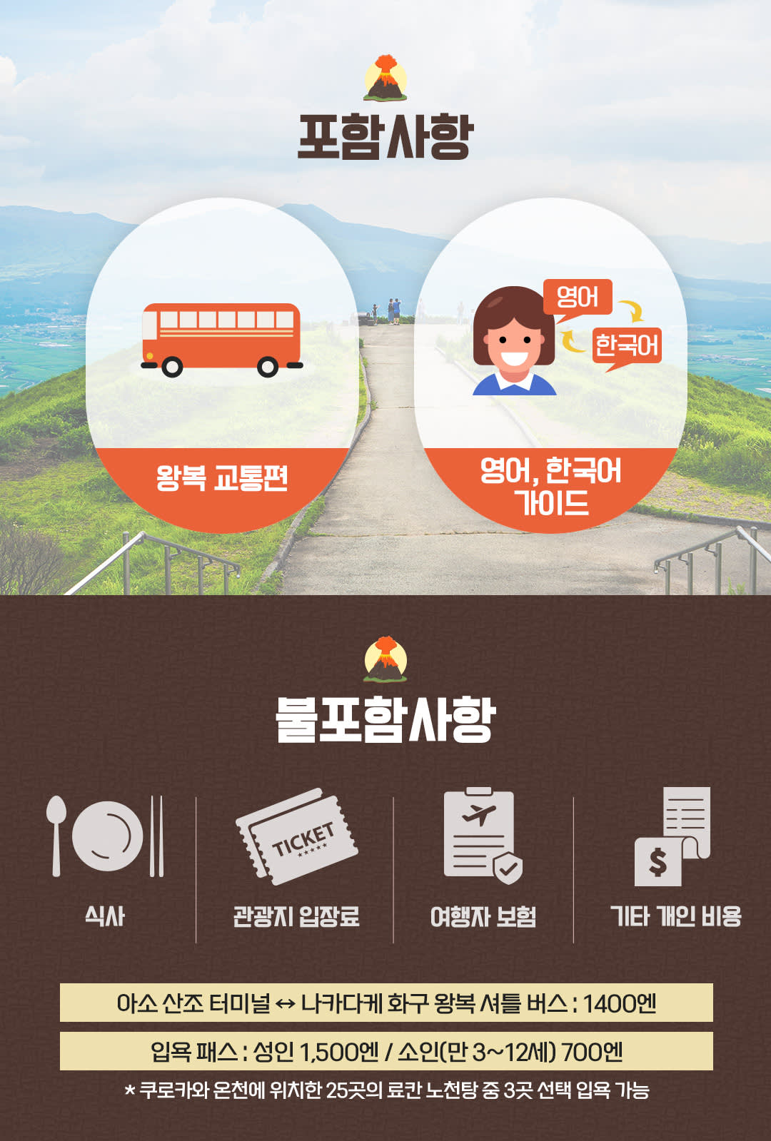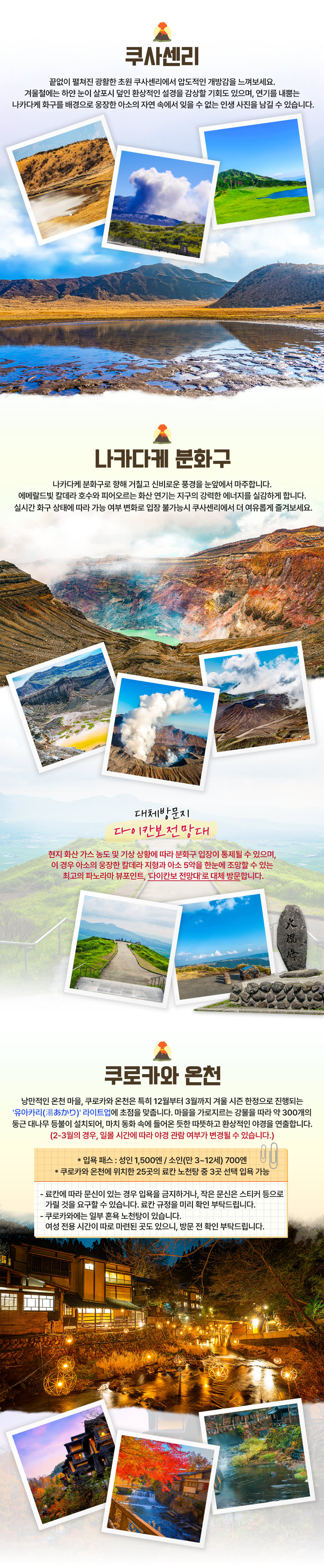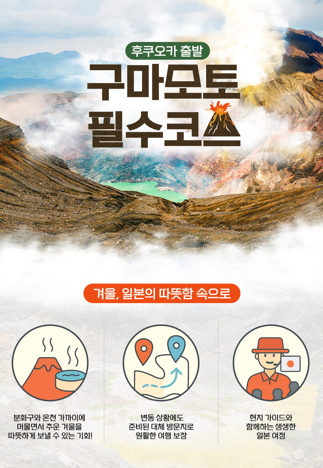 📢 현재 1/20 발생한 헬리콥터 추락 사고로 인해 아소산 분화구 입장이 제한되고 있습니다. 제한 기간 동안은 대체지인 [다이칸보] 혹은 [카미시키미 쿠마노이마스 신사]을 방문할 예정입니다. (화구접근불가능시 코스 참고 부탁드립니다. 통제 해제 시 즉시 기존 일정대로 진행될 예정입니다.)
