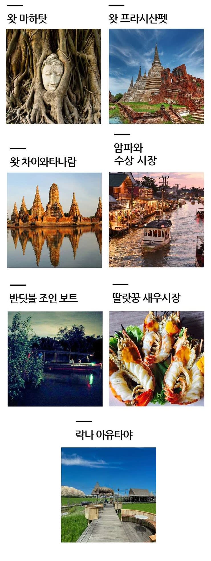 세게 문화유산으로 등재되어 있는 태국의 고대 도시였던 아유타야 관광과, 금, 토, 일요일 단 3일만열리는 주말 시장인 암파와를 오후 일정으로 관광하는 상품이 결합된 원데이 단독 투어입니다.