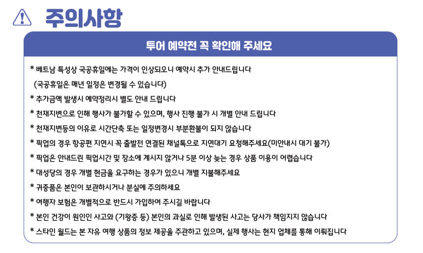 * 베트남 특성상 국공휴일에는 가격이 인상되오니 예약시 추가 안내드립니다 (국공휴일은 매년 일정은 변경될 수 있습니다) * 추가금액 발생시 예약정리시 별도 안내 드립니다 * 천재지변으로 인해 행사가 불가할 수 있으며, 행사 진행 불가 시 개별 안내 드립니다 * 천재지변등의 이유로 시간단축 또는 일정변경시 부분환불이 되지 않습니다 * 픽업의 경우 항공편 지연시 꼭 출발전 연결된 채널톡으로 지연대기 요청해주세요(미안내시 대기 불가) * 픽업은 안내드린 픽업시간 및 장소에 계시지 않거나 5분 이상 늦는 경우 상품 이용이 어렵습니다 * 대성당의 경우 개별 현금을 요구하는 경우가 있으니 개별 지불해주세요 * 귀중품은 본인이 보관하시거나 분실에 주의하세요 * 여행자 보험은 개별적으로 반드시 가입하여 주시길 바랍니다 * 본인 건강이 원인인 사고와 (기왕증 등) 본인의 과실로 인해 발생된 사고는 당사가 책임지지 않습니다 * 스타인 월드는 본 자유 여행 상품의 정보 제공을 주관하고 있으며, 실제 행사는 현지 업체를 통해 이뤄집니다