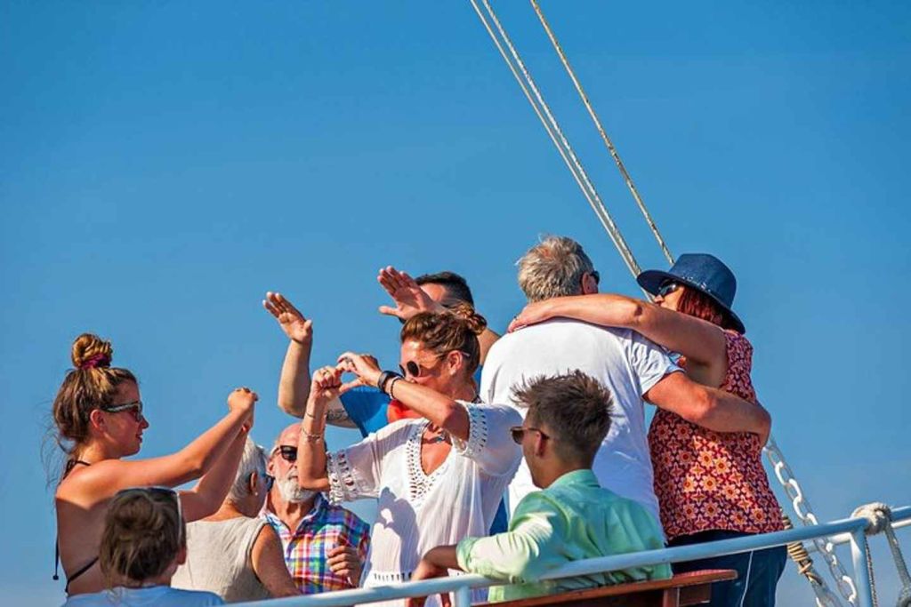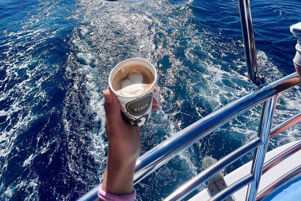 보트 오픈 바에서 음료를 즐기며 머리카락에 바람을 느껴보세요.