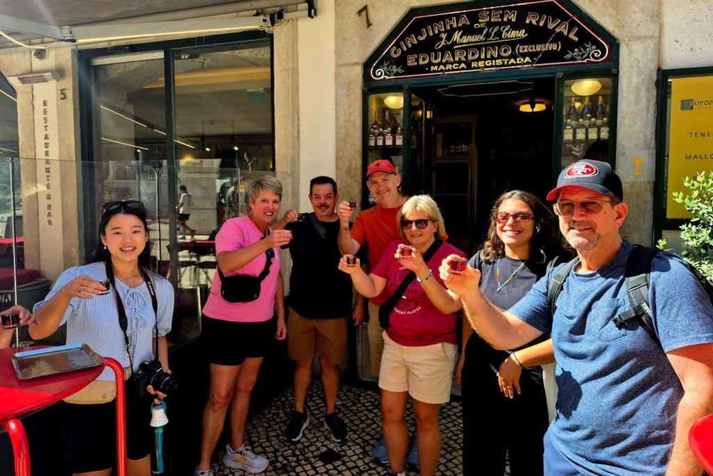 리스본의 상징적인 동네를 거닐며 현지인에게 인기 있는 달콤하고 톡 쏘는 체리 주류인 진지냐를 맛볼 수 있습니다.