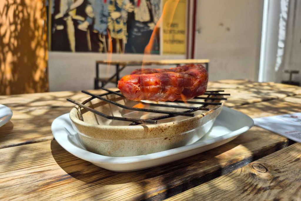 그다음에는 불에 구운 포르투갈 소시지인 '쇼리수 아사두'의 스모키하고 소박한 맛을 즐겨보세요. 강렬한 레드 와인 한 잔이 완벽한 짝을 이룹니다.