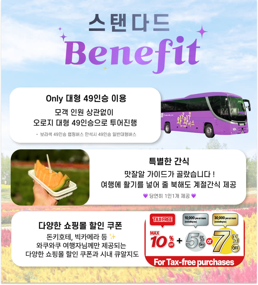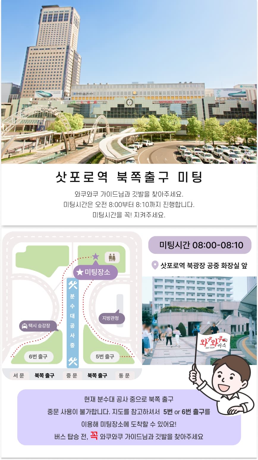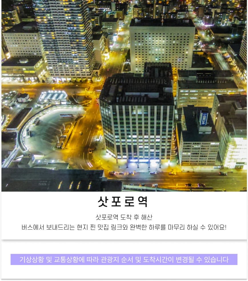 🍦 맛잘알 가이드의 북해도 계절간식 1인 1개 제공! 🗣 말 안 통해서 눈치 볼 일 NO! 알잘딱깔센 한국인 가이드가 현지 꿀팁까지 전달 완료~ 🎁 재방문 고객님께만 드리는 소소한 스페셜 선물! (지역 특산 선물까지 있는 건 안 비밀!) 🧠 관광지 가는 길도 심심할 틈 없이! 365 퀴즈 타임으로 깨알 재미까지! 🛍️ 맛집 고민 끝! QR 맛집 지도 + 돈키호테 쿠폰까지 알차게 가져가세요!