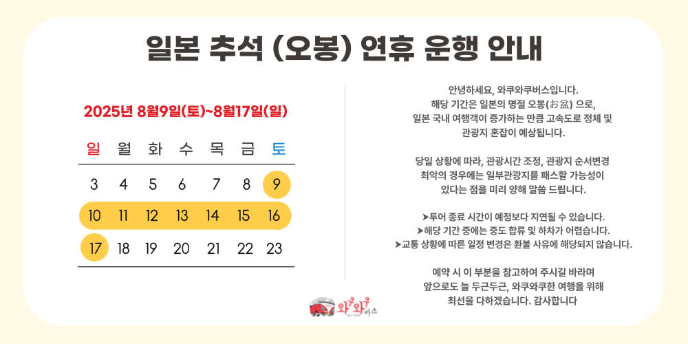 * 버스 좌석은 지정석이 아닌 전좌석 선착순 자유 승차임을 확인 부탁 드립니다.