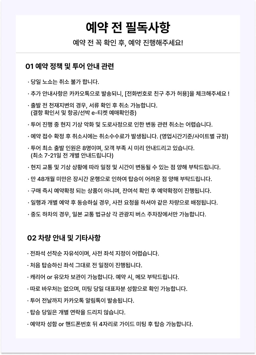 ▶[북해도 1호선 스탠다드] 비에이 후라노 코스 대형버스 - 이용요건 * 만 4세 이상만 본 액티비티에 참여할 수 있습니다. * 본 액티비티의 최소 참여 인원은 8인입니다. 최소 참여 인원이 채워지지 않을 경우, 다른 날짜로 변경하거나 전액 환불이 가능합니다. - 추가정보 - 차량 & 수하물 정보 * 탑승 가능 인원수: 44인 (운전기사 제외)