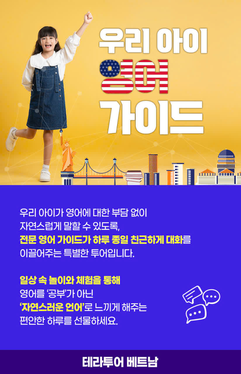 📮 바우처안내 - 바우처는 별도로 없으며 예약 확정내용에 대해서 등록된 이메일로 확정내용 정리해서 발송됩니다. → 발송되는 메일 주소 : vntourvch@teratour.kr → 확정 내용을 반드시 꼼꼼히 확인해 주세요. 이용 시 혼선이나 문제가 발생하지 않도록 사전 확인이 필요합니다. → 예약된 내용과 안내된 내용이 다른 경우 즉시 회신 부탁드립니다. 회신이 없는 경우, 발송된 확정된 내용으로 진행됩니다. 🧑💼 가이드투어 이용 안내 🌀우리아이 전용 전문 영어가이드를 배정해드립니다. 🌀 가이드는 미팅시간부터 투어종료까지 손님의 투어를 도와드립니다. 🌀 가이드분에게 원하시는 내용을 명확하게 표현해주셔야지 투어 중 손님이원하시는 내용을 인지하고 진행해드릴 수 있습니다. 🌀 가이드는 별도로 식사를 하며, 같이 식사를 하시거나 가이드 식사를 구입해주지 않아도 됩니다. 🌀 가이드는 전문성이 있는 가이드가 아닌 여행친구, 여행인솔자로 생각하시면됩니다.