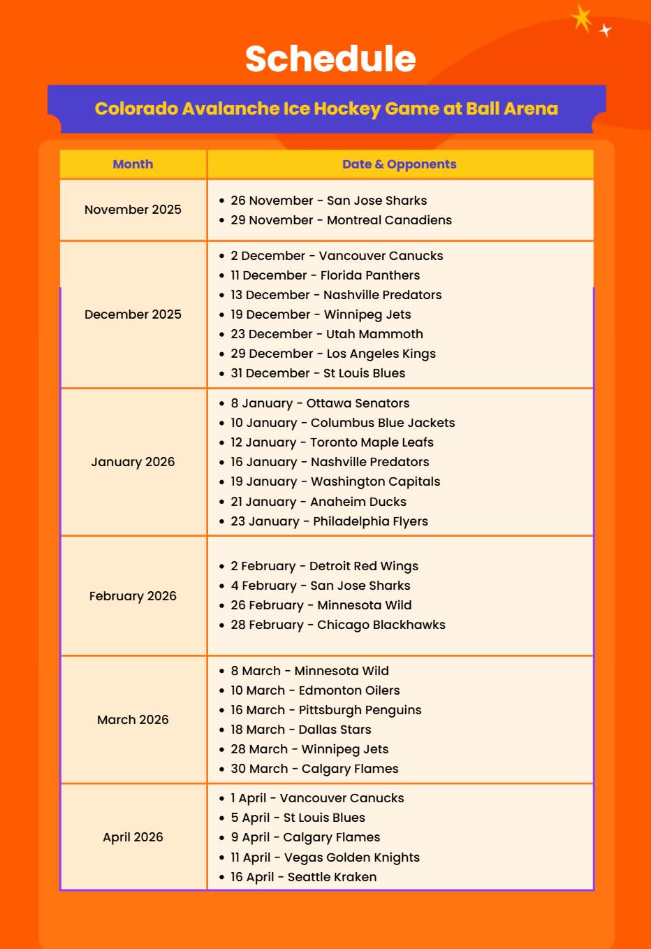 * 애벌랜치가 최고의 NHL 팀들과 맞붙는 경기를 볼 수 있는 여러 경기 날짜 중에서 선택하세요.