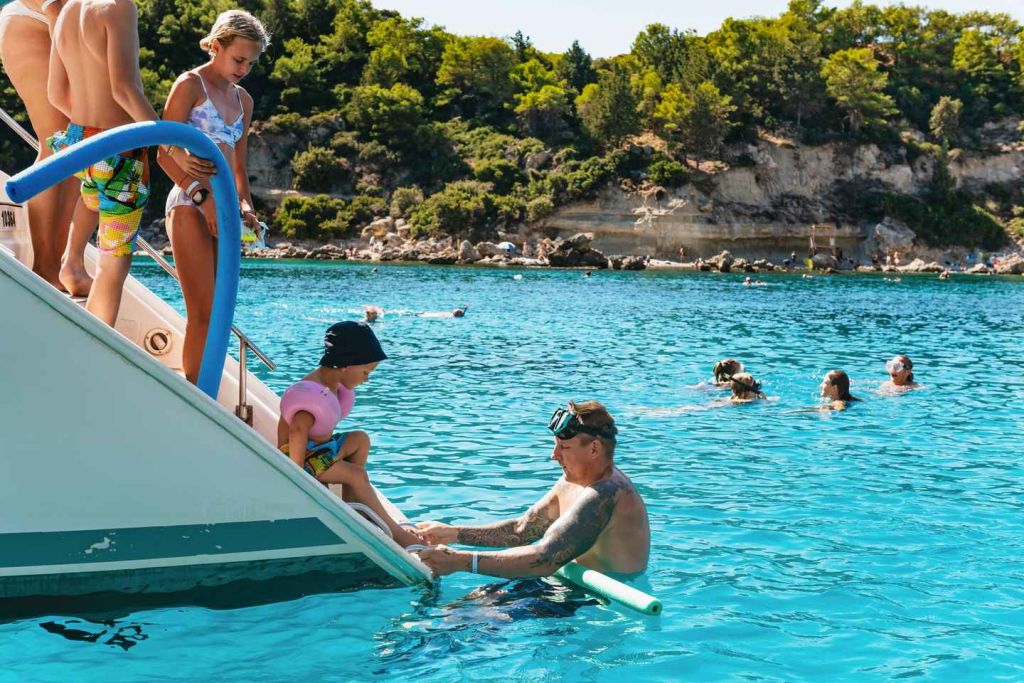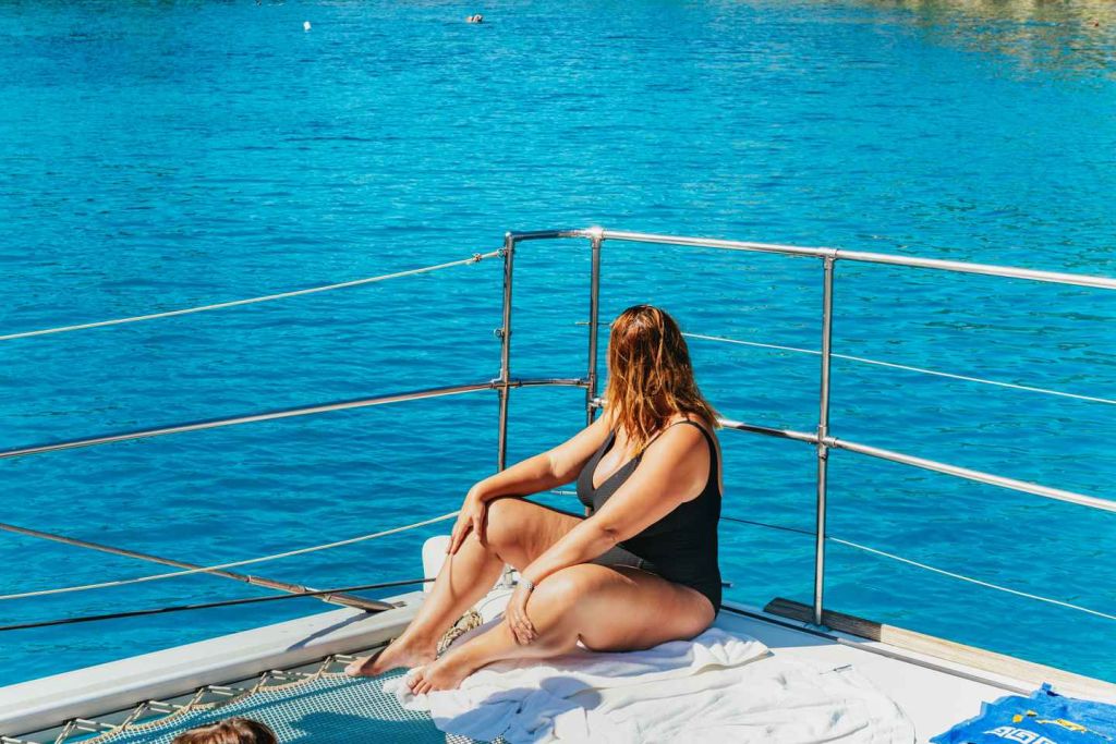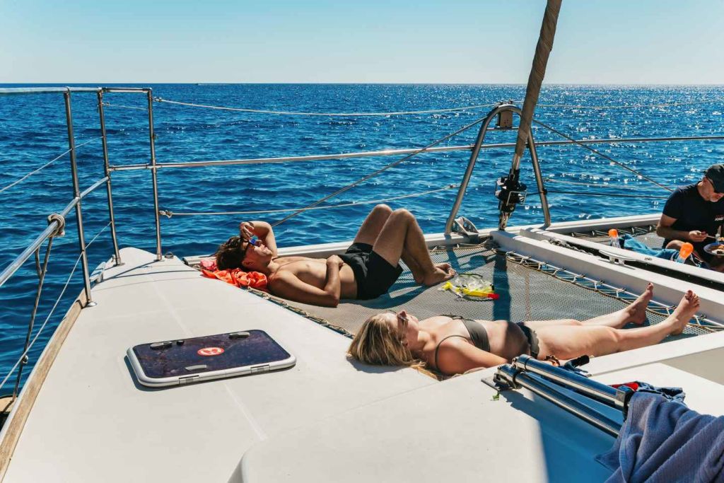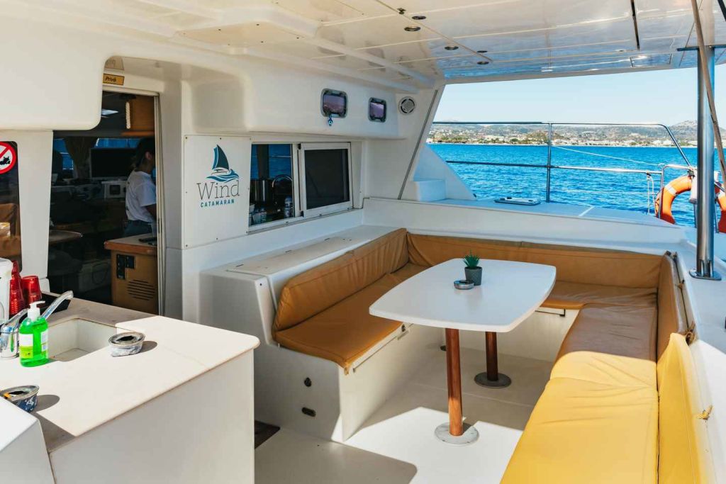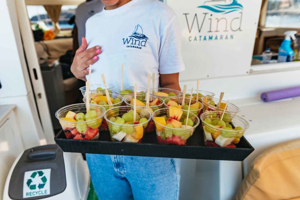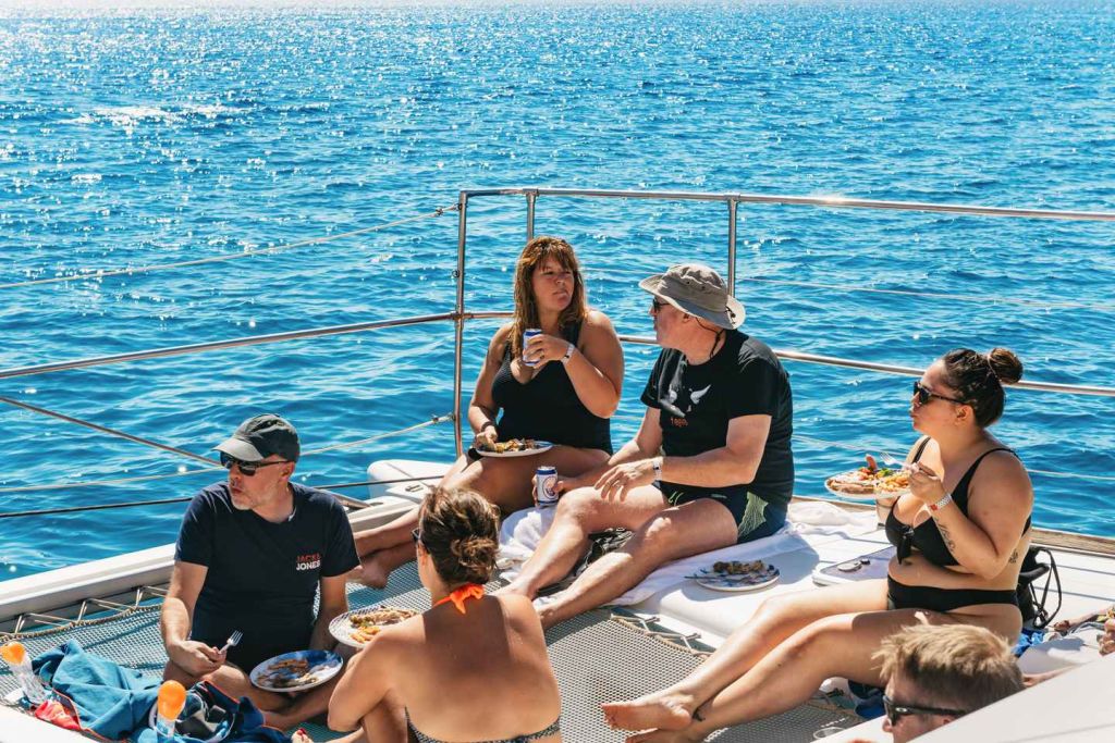 그 후 선상에서 준비된 지중해식 점심 식사를 즐기세요. 파워 카타마란 옵션을 선택하면 아름다운 라디코 베이에 추가 기항합니다.