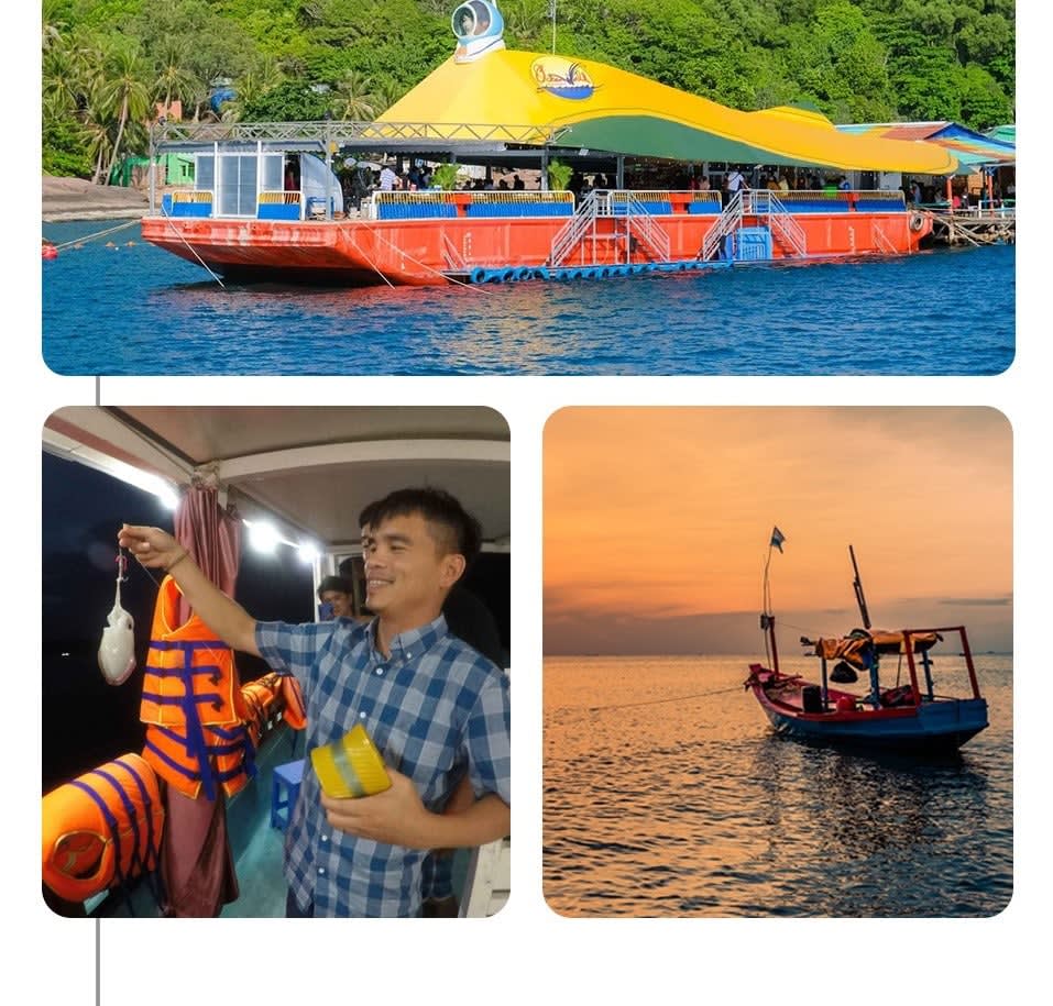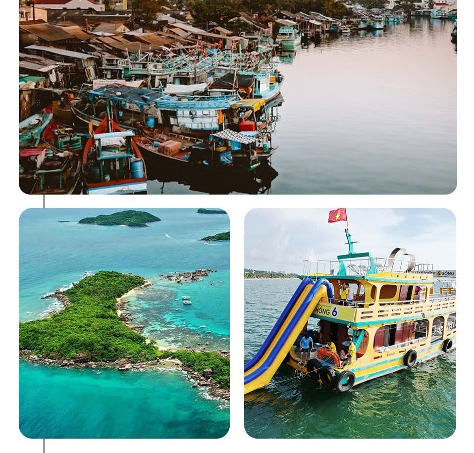 * 푸꾸옥의 투명한 바닷속을 구경하고, 오징어 낚와 워터 슬라이드도 즐겨 보세요.