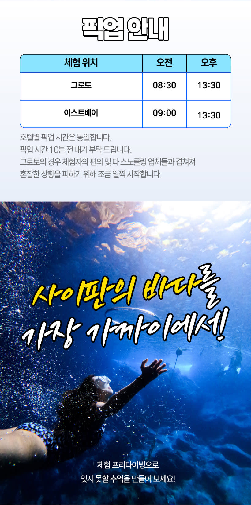 - 현지 투어 이용시 문제가 발생했을 경우 즉각 해당 업체에 연락을 취해 조치를 받으시기 바랍니다. - 고객 부주의 등으로 발생한 부상 및 모든 사고에 대해서는 본인이 책임져야 하며, 예약대행사인 사이판플레이와 현지업체(이하 면책자들)에게 책임을 전가할 수 없습니다.