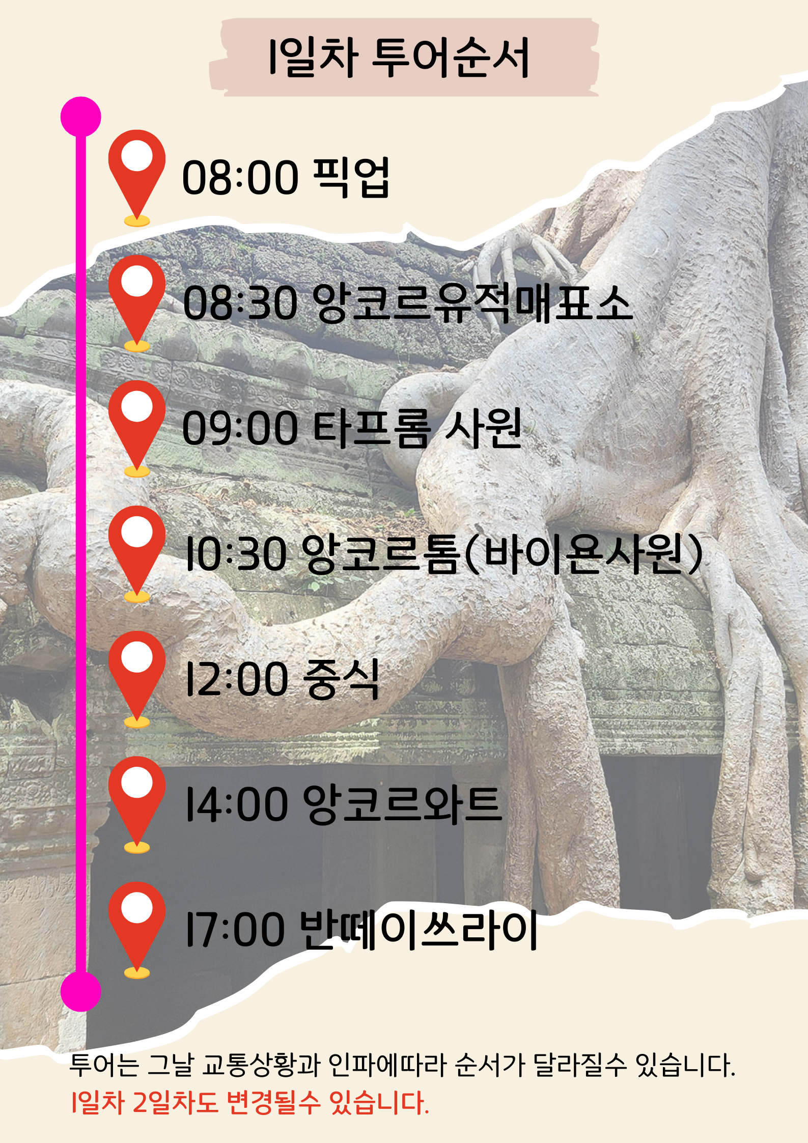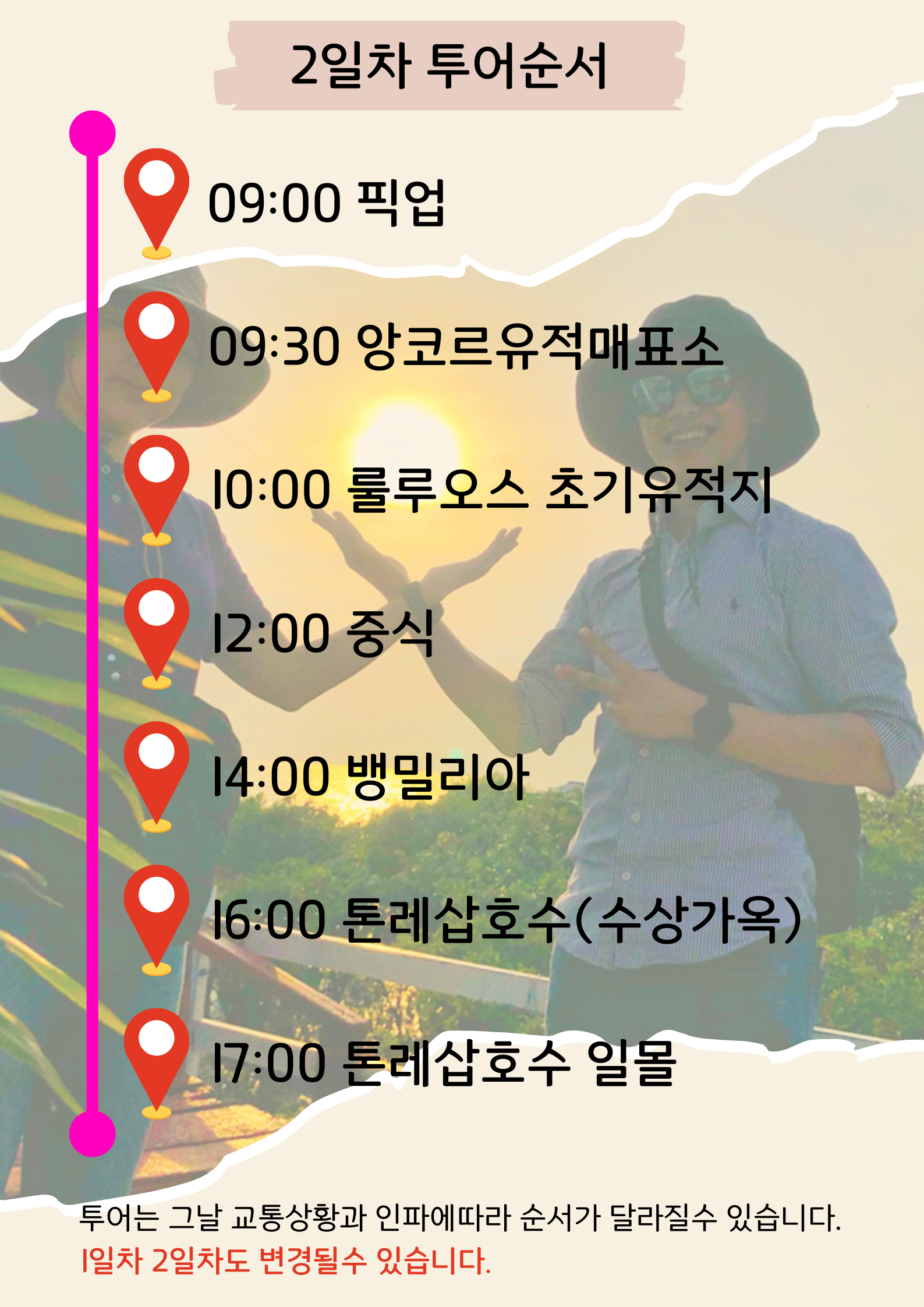 이 투어는 비키나이스투어라고 불리는데 2일 동안 씨엠립의 유명 관광지를 돌아보는 그룹 조인투어로 2명이상 모객후 진행됩니다. 1명 예약 가능합니다.