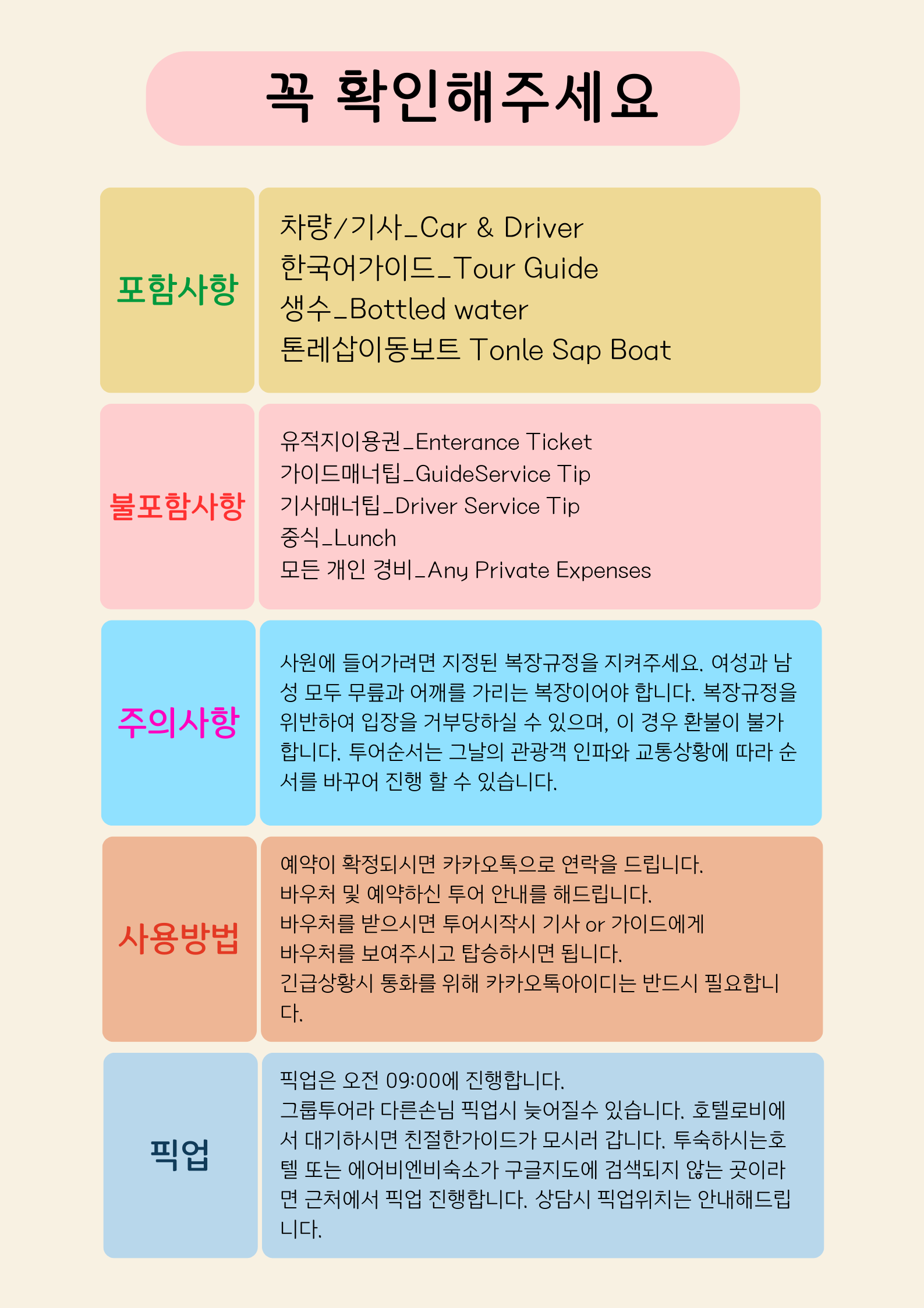 이 투어는 한국어로 진행되는 한국어가이드 투어입니다. 한국에서 오신 다양한 여행자들과 함께 하는 그룹투어입니다. 예약 확정된 후 발권되는 영어 및 한글로로 된 바우처를 모바일에 저장 또는 프린트 하신 후 지참 하신 후 투어에 참가해주셔야 합니다. 현지 교통 상황에 따라 투어순서는 변경될수있습니다 사원에 들어가려면 지정된 복장규정을 지켜주세요. 여성과 남성 모두 무릎과 어깨를 가리는 복장이어야 합니다. 복장규정을 위반하여 입장을 거부당하실 수 있으며, 이 경우 환불이 불가합니다. 투어순서는 그날의 관광객 인파와 교통상황에 따라 순서를 바꾸어 진행 할 수 있습니다.
