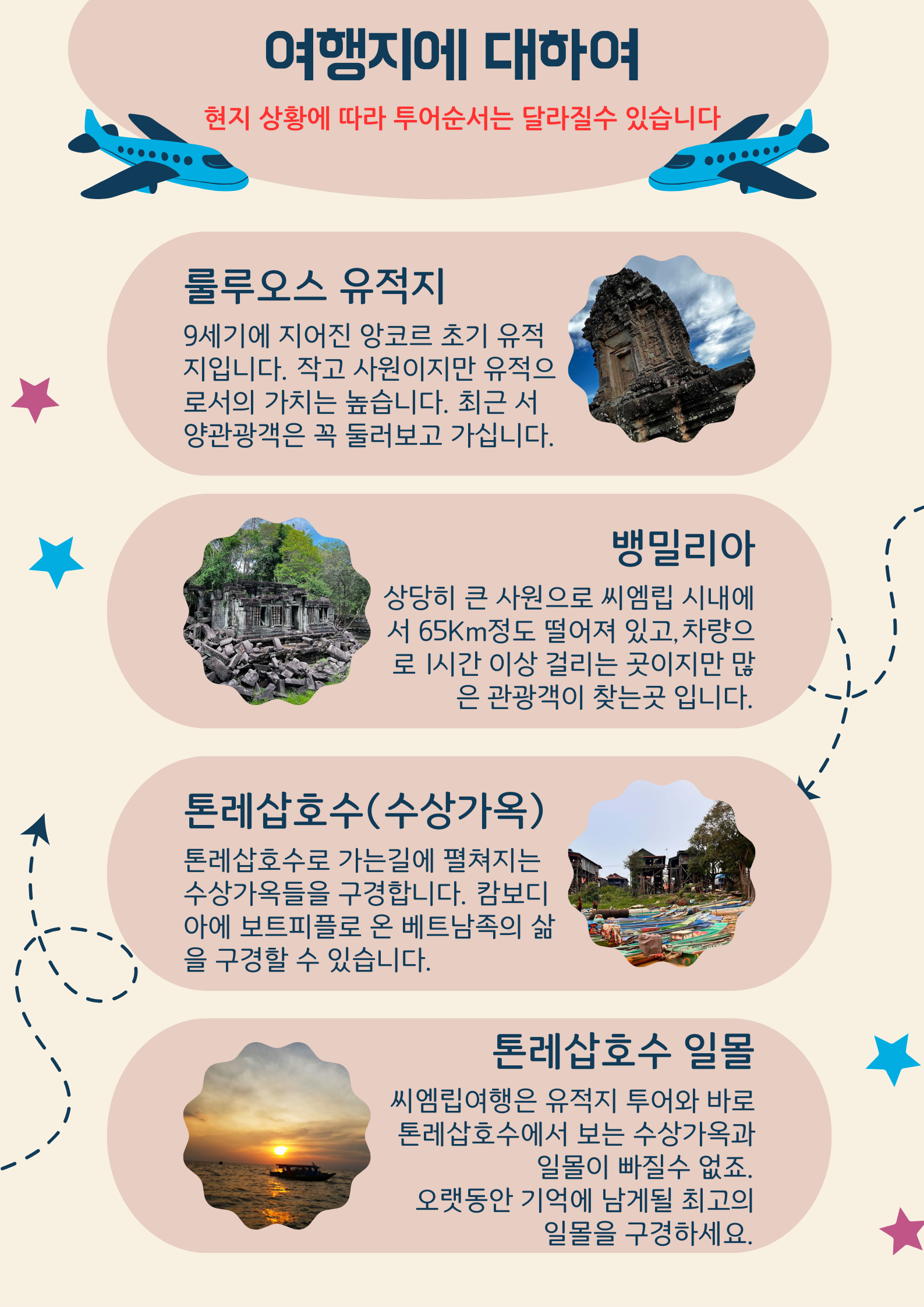세계 최대의 고대 유적군 앙코르유적지에는 세계7대 불가사의라 불리우는 앙코르와트와 크메르의 미소라 불리우는 바이욘 사원, 자연과 인공의 절묘한 조화를 보는 타프롬 사원, 여인의 성체라 불리우는 반떼이쓰라이는 캄보디아 유적지 필수 코스 입니다. 또한 시내에서 70Km 떨어진 뱅밀리아는 영화 알포인트 촬영 뿐만 아니라 외국 영화의 단골 촬영지이기도 합니다. 무너진 사원 뱅밀리아와 톤레삽호수에서 보는 일몰은 깊은 추억으로 남게 될것입니다. 또한 숙련된 한국어 가이드가 멋진 포토존과 힌두신화와 크메르역사이야기, 불교이야기 해설 등으로 아주 재미난 투어를 즐길수 있습니다.