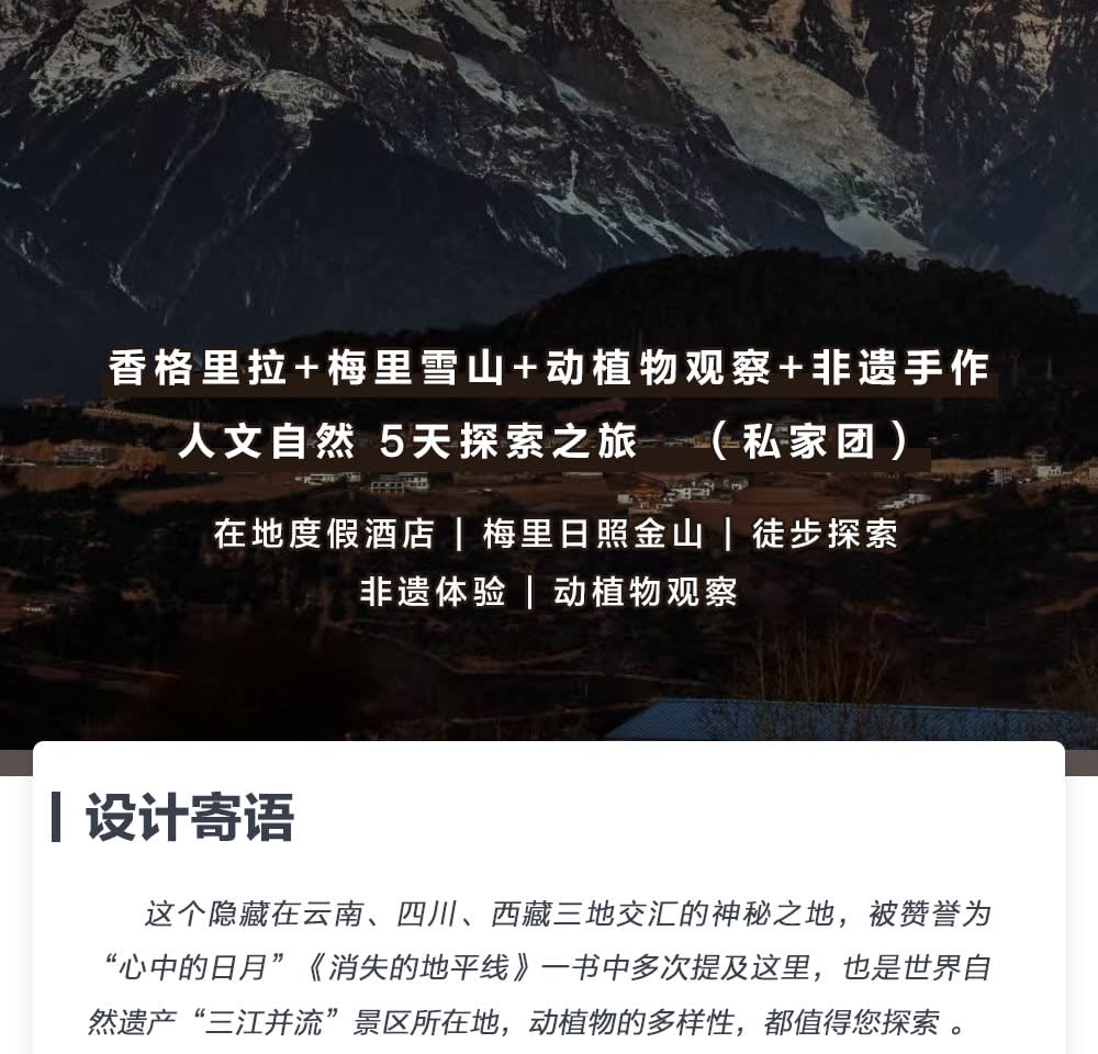 * 예위 예징 호텔은 "세계에서 가장 아름다운 설산"으로 알려진 메이리 설산 기슭의 우방샤 마을에 위치하고 있습니다. 메이리 설산에 가장 가까운 야생 전망 호텔입니다.