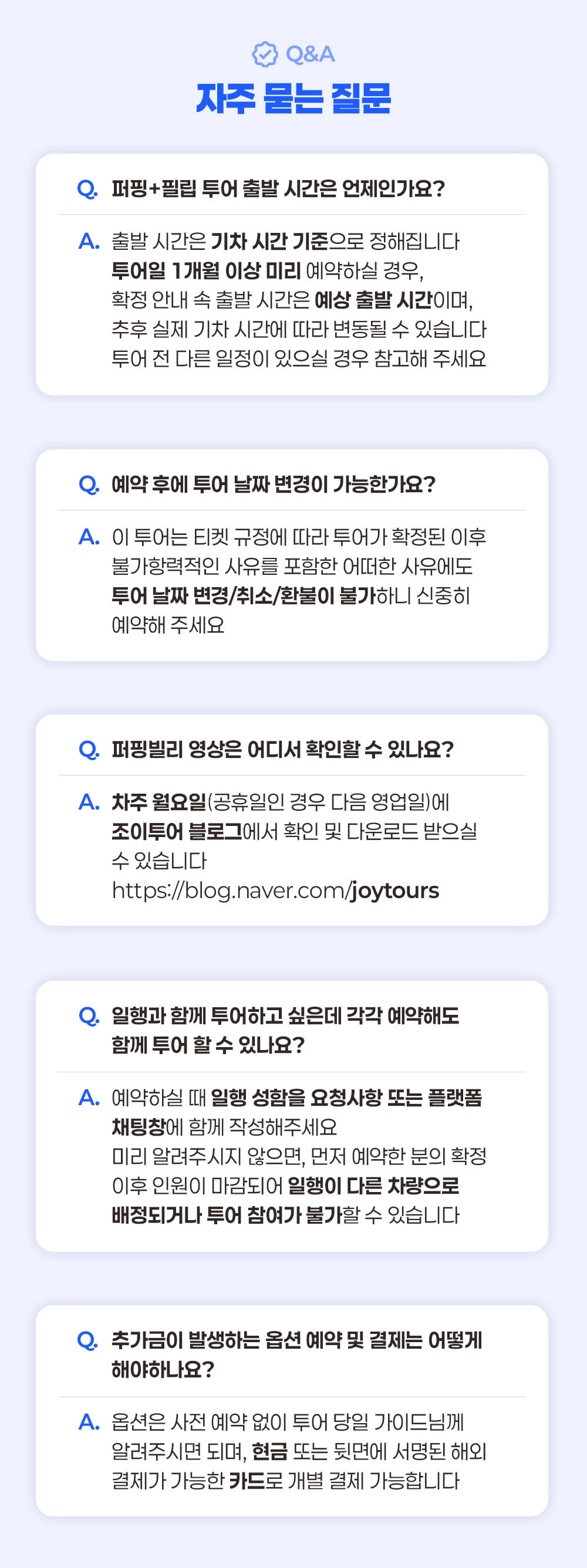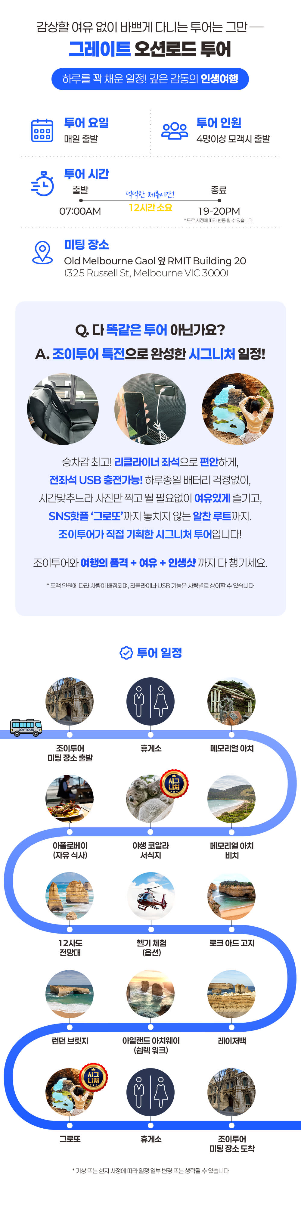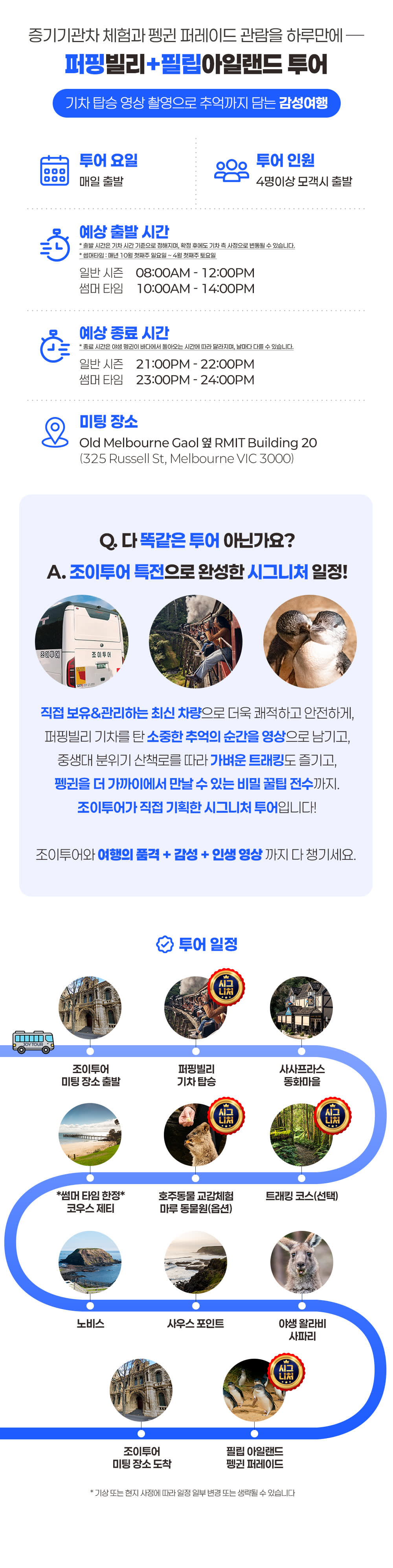 โœ… ์ทจ์†Œยทํ™˜๋ถˆ ์ •์ฑ… - ์˜ˆ์•ฝ ํ™•์ • ํ›„ ๋‚ ์งœ๋ณ€๊ฒฝ/์ทจ์†Œ/ํ™˜๋ถˆ ๋ถˆ๊ฐ€ โ€ป ์˜ˆ์•ฝ ํ™•์ • ์ฆ‰์‹œ ํ‹ฐ์ผ“, ๊ฐ€์ด๋“œ, ์ฐจ๋Ÿ‰ ๋“ฑ์ด ๋ฐฐ์ •๋˜์–ด ํˆฌ์–ด ์ค€๋น„๊ฐ€ ์ง„ํ–‰๋˜๋ฏ€๋กœ, ๊ฒฐ์ œ ํ›„ 24์‹œ๊ฐ„ ์ด๋‚ด๋ผ๋„ ์˜ˆ์•ฝ ํ™•์ • ํ›„์—๋Š” ์‚ฌ์œ  ๋ถˆ๋ฌธ 100% ์ทจ์†Œ ์ˆ˜์ˆ˜๋ฃŒ(ํ˜„์ง€ ์˜ˆ์•ฝ๊ธˆ)๊ฐ€ ๋ฐœ์ƒํ•˜๋ฉฐ, ๋‚ ์งœ ๋ณ€๊ฒฝยท์ทจ์†Œยทํ™˜๋ถˆ์ด ๋ถˆ๊ฐ€ํ•ฉ๋‹ˆ๋‹ค. ์˜ˆ์•ฝ ์‹œ ๋ฐ˜๋“œ์‹œ ์‹ ์ค‘ํžˆ ํ™•์ธํ•ด ์ฃผ์„ธ์š”. โ€ป ๋ชจ๋“  ์ทจ์†Œยทํ™˜๋ถˆ ์š”์ฒญ์—๋Š” ์‚ฌ์œ ๋ฅผ ๋ถˆ๋ฌธํ•˜๊ณ  ์˜ˆ์™ธ ์—†์ด ๋™์ผํ•œ ๊ทœ์ •์ด ์ ์šฉ๋ฉ๋‹ˆ๋‹ค. ํ•ญ๊ณตยท๊ตํ†ตํŽธ ๋ฌธ์ œ, ์งˆ๋ณ‘ยท๋ถ€์ƒยท์ˆ˜์ˆ , ๊ฐ€์กฑ์ƒ, ์‚ฌ๊ณ ยท๊ธด๊ธ‰ ์ƒํ™ฉ, ์ฒœ์žฌ์ง€๋ณ€ ๋“ฑ ๋ถˆ๊ฐ€ํ•ญ๋ ฅ์ ์ธ ์‚ฌ์œ ๋Š” ๋ฌผ๋ก , ๋ช…์‹œ๋˜์ง€ ์•Š์€ ๊ธฐํƒ€ ์‚ฌ์œ  ๋˜ํ•œ ์˜ˆ์™ธ๋กœ ์ธ์ •๋˜์ง€ ์•Š์Šต๋‹ˆ๋‹ค. โ€ป ํผํ•‘๋นŒ๋ฆฌ ๊ธฐ์ฐจ ์‹œ๊ฐ„์€ ํ˜„์ง€ ์‚ฌ์ •์— ๋”ฐ๋ผ ๋ณ€๋™๋  ์ˆ˜ ์žˆ์œผ๋ฉฐ, ์ด์— ๋”ฐ๋ผ ํ™•์ • ์•ˆ๋‚ด๋œ ์ง‘๊ฒฐ ์‹œ๊ฐ„ ๋ฐ ์ผ๋ถ€ ์ผ์ •์ด ๋ณ€๊ฒฝยท์ œ์™ธ๋  ์ˆ˜ ์žˆ์Šต๋‹ˆ๋‹ค. ์ด๋กœ ์ธํ•œ ์ทจ์†Œยท๋ณ€๊ฒฝยทํ™˜๋ถˆ์€ ๋ถˆ๊ฐ€ํ•˜์˜ค๋‹ˆ ํˆฌ์–ด ์ „ยทํ›„๋กœ๋Š” ๋‹ค๋ฅธ ์ผ์ •์„ ์žก์ง€ ์•Š๋Š” ๊ฒƒ์„ ๊ถŒ์žฅ๋“œ๋ฆฝ๋‹ˆ๋‹ค. โ€ป ์ง€๊ฐ ๋˜๋Š” ๋…ธ์‡ผ(No-show)๋Š” ์‚ฌ์œ  ๋ถˆ๋ฌธ ํˆฌ์–ด ๋‹น์ผ ์ทจ์†Œ๋กœ ๊ฐ„์ฃผ๋˜๋ฉฐ, ํ™˜๋ถˆ์ด ๋ถˆ๊ฐ€ํ•ฉ๋‹ˆ๋‹ค. โœ… ํฌํ•จ์‚ฌํ•ญ โœ”๏ธ ์ „๋ฌธ ์ž๊ฒฉ์ฆ ๋ณด์œ ! ๊ฒฝ๋ ฅ ํ’๋ถ€ํ•œ ์กฐ์ดํˆฌ์–ด ๊ฐ€์ด๋“œ โœ”๏ธ ์ž์ฒด ๋ณด์œ &์ •๋น„ํ•˜๋Š” ํ”„๋ฆฌ๋ฏธ์—„ 3๋…„๋ฏธ๋งŒ ์‹ ์ฐจ โœ”๏ธ ๊ณ ๊ฐ ์•ˆ์ „ ์ตœ์šฐ์„ ! ์•ˆ์‹ฌ ์ฐจ๋Ÿ‰ ๋ณดํ—˜ โœ”๏ธ ๋ฐฉ๋ฌธ์ง€ ์ž…์žฅ๋ฃŒ(์˜ต์…˜ ํˆฌ์–ด ์ œ์™ธ) โœ… ๋ถˆํฌํ•จ ์‚ฌํ•ญ โŒ ๊ฐœ์ธ ์—ฌํ–‰์ž ๋ณดํ—˜ โŒ ์˜ต์…˜ ํˆฌ์–ด ๋น„์šฉ โŒ ์‹์‚ฌ ๋น„์šฉ โŒ ๊ธฐํƒ€ ๊ฐœ์ธ ๊ฒฝ๋น„ โœ… ์˜ˆ์•ฝ ๊ด€๋ จ ์•ˆ๋‚ด - ์˜ˆ์•ฝ ์‹œ โ€œํ˜ธ์ฃผ์—์„œ ์—ฐ๋ฝ ๊ฐ€๋Šฅํ•˜๊ฑฐ๋‚˜ ์นดํ†ก ์•Œ๋ฆผ ์ˆ˜์‹ ์ด ๊ฐ€๋Šฅํ•œ ๋ฒˆํ˜ธโ€๋ฅผ ๋ฐ˜๋“œ์‹œ ๊ธฐ์žฌํ•ด ์ฃผ์„ธ์š”. - ์˜ˆ์•ฝ ์‹œ 18์„ธ ๋ฏธ๋งŒ ๊ณ ๊ฐ์ด ํฌํ•จ๋  ๊ฒฝ์šฐ, ๋™๋ฐ˜ํ•˜๋Š” ํ•ด๋‹น ์ธ์› ์ „์›์˜ ์ƒ๋…„์›”์ผ์„ ์ •ํ™•ํžˆ ๊ธฐ์žฌํ•ด ์ฃผ์‹œ๊ธฐ ๋ฐ”๋ž๋‹ˆ๋‹ค. - ์ผํ–‰๊ณผ ๊ฐ๊ฐ ์˜ˆ์•ฝํ•˜์‹ค ๊ฒฝ์šฐ, ์˜ˆ์•ฝํ•˜์‹ค ๋•Œ ์ผํ–‰ ์„ฑํ•จ์„ ์š”์ฒญ์‚ฌํ•ญ ๋˜๋Š” ํ”Œ๋žซํผ ์ฑ„ํŒ…์ฐฝ์— ํ•จ๊ป˜ ์ž‘์„ฑํ•ด์ฃผ์„ธ์š”. ๋ฏธ๋ฆฌ ์•Œ๋ ค์ฃผ์‹œ์ง€ ์•Š์œผ๋ฉด, ๋จผ์ € ์˜ˆ์•ฝํ•œ ๋ถ„์˜ ํ™•์ • ์ดํ›„ ์ธ์›์ด ๋งˆ๊ฐ๋˜์–ด ์ผํ–‰์ด ๋‹ค๋ฅธ ์ฐจ๋Ÿ‰์œผ๋กœ ๋ฐฐ์ •๋˜๊ฑฐ๋‚˜ ํˆฌ์–ด ์ฐธ์—ฌ๊ฐ€ ๋ถˆ๊ฐ€ํ•  ์ˆ˜ ์žˆ์Šต๋‹ˆ๋‹ค. - ์˜ˆ์•ฝ ํ™•์ • ์•ˆ๋‚ด๋ฅผ ๋ฐ›๊ธฐ ์ „๊นŒ์ง€๋Š” ๋ฏธํ™•์ • ์ƒํƒœ์ด๋ฉฐ, ํˆฌ์–ด ์ฐธ์—ฌ๊ฐ€ ๋ถˆ๊ฐ€ํ•ฉ๋‹ˆ๋‹ค. - ํˆฌ์–ด ์ „๋‚  ์˜คํ›„ 4์‹œ๊ฒฝ ๋ฆฌ๋งˆ์ธ๋“œ ์•Œ๋ฆผํ†ก์ด ์˜ˆ์•ฝ ์‹œ ๊ธฐ์