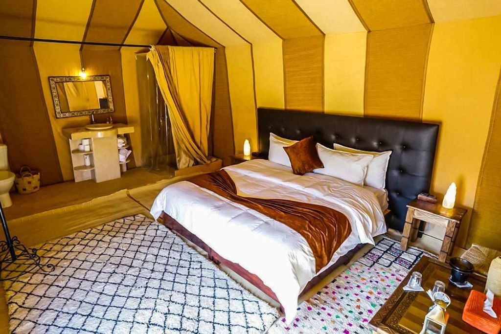 일찍 일어나서 일출을 본 후 아침 식사(선택 항목)를 하세요. 마라케시로 모실 교통편이 대기합니다. 현지 레스토랑에서 점심 식사를 즐기세요. 오후 8시경에 원래 출발 지점 또는 제마엘프나(Djemaa El Fna)에 도착합니다. 베두인 캠프에서 간이 샤워 시설, 화장실, 5성급 어메니티가 있는 럭셔리 개인 텐트인 디럭스 사막 캠프로 업그레이드 해보세요. 이 업그레이드는 참가자 개별 예약이 필요합니다.