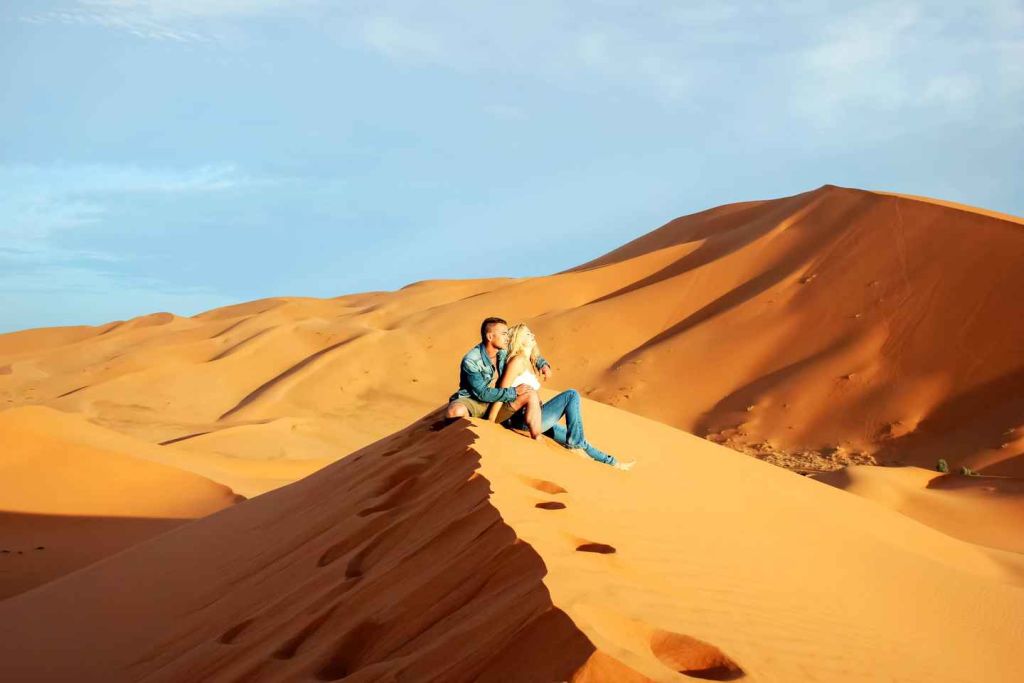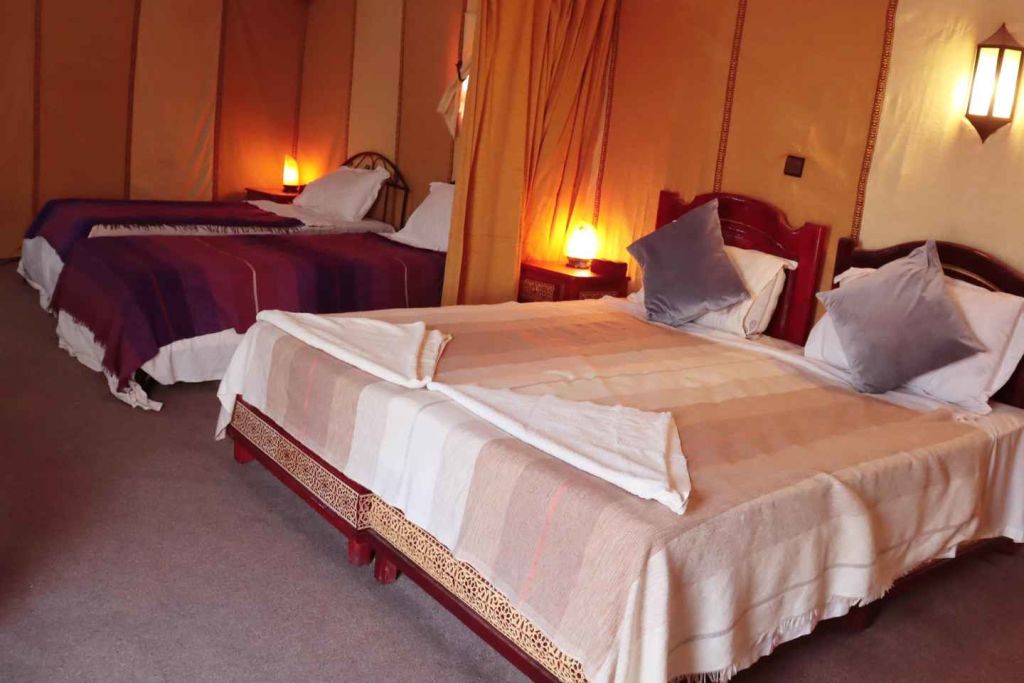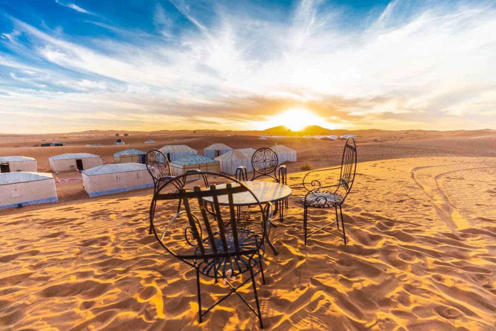 아침 식사를 마치고 호텔을 출발해 틴기르와 드라마틱한 토드라 협곡으로 이동합니다. 협곡을 탐험할 수 있는 자유 시간을 잠깐 가지고 현지 카페에서 점심을 즐깁니다. 현지 카페에서 점심 식사를 즐기고 낙타 캐러밴을 만나기 위해 메르조가로 계속 이동합니다. 낙타 등에 올라 에르그 셰비(Erg Chebbi) 모래 언덕을 체험하며 일몰을 감상하세요. 해질녘 전에 사막 캠프에 도착하여 별 아래에서 정통 모로코 식 저녁 식사를 즐깁니다. 현지 유목인이 엔터테인먼트를 제공하며 전통 탐 탐 드럼을 연주하는 법을 알려줍니다. 저녁 식사를 즐기면서 하룻밤을 보냅니다.