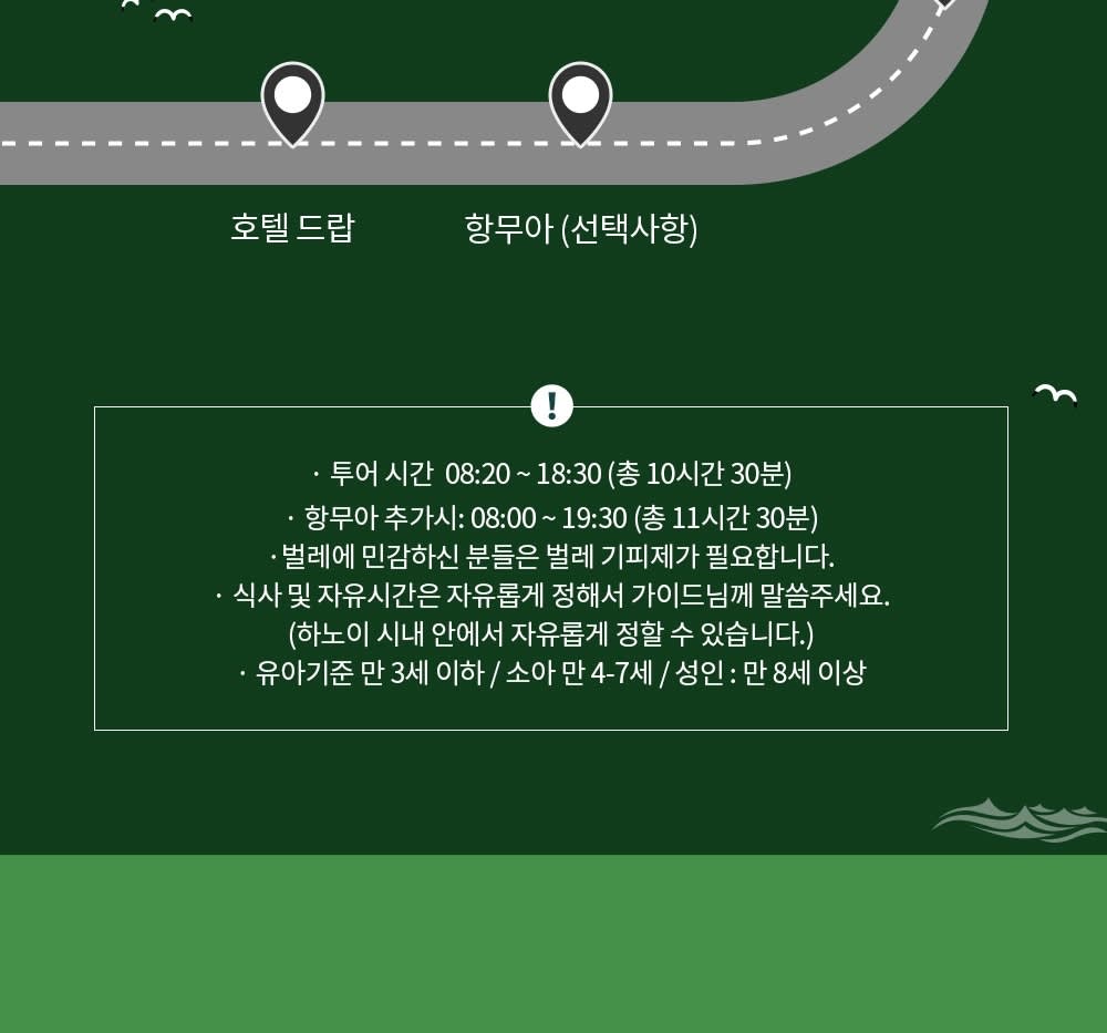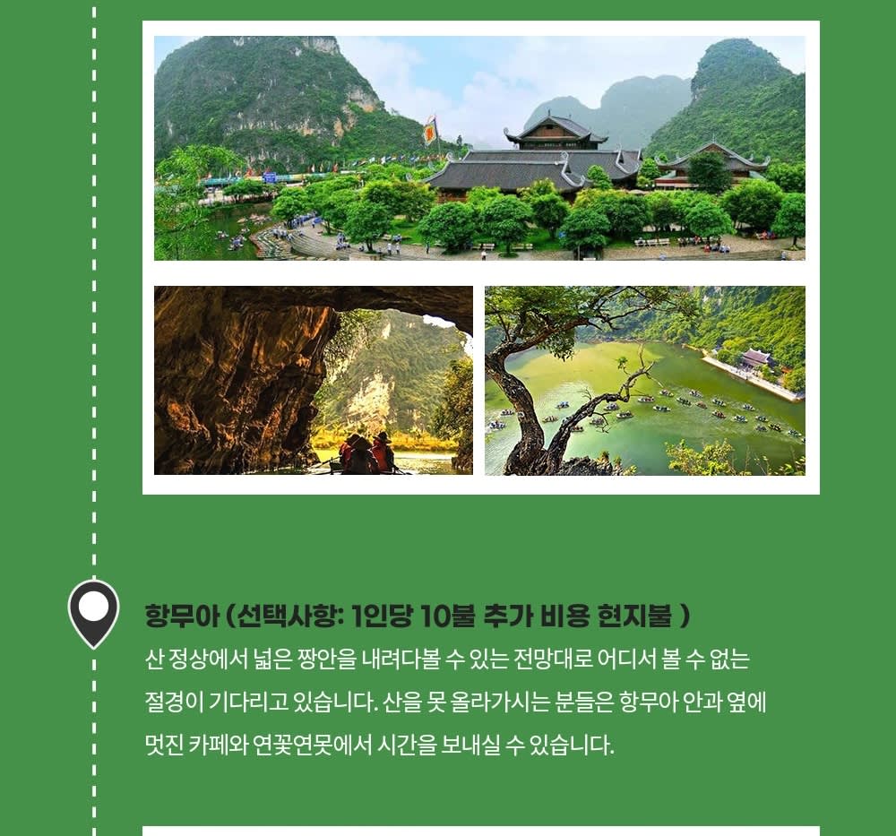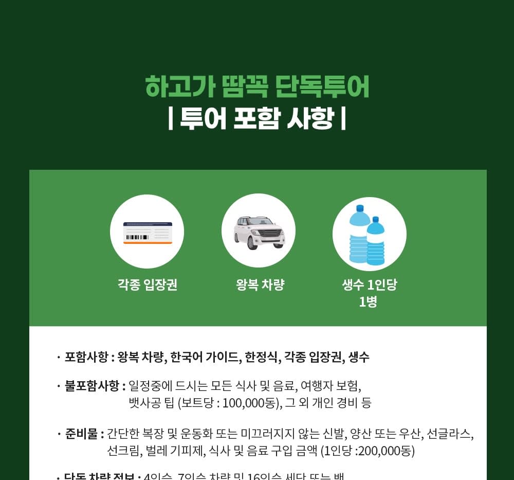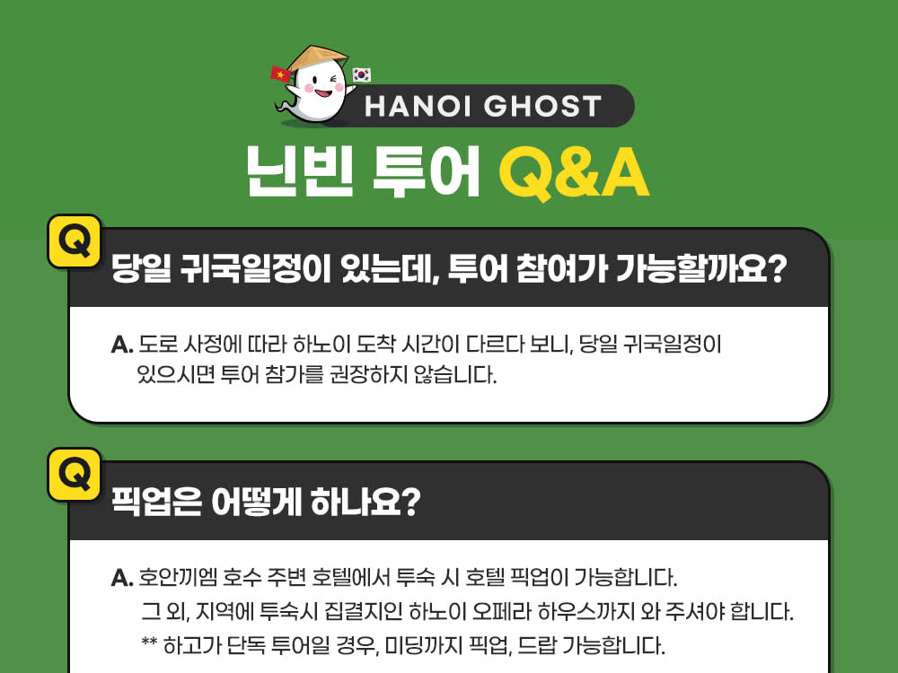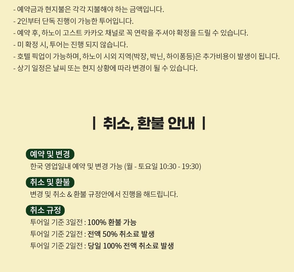 * 카카오채널로 연락주셔야 예약확정 가능하니 반드시 예약시에는 해당 카카오 채널로 연락바랍니다. (카톡검색시 @하노이고스트투어) * 베트남 국/공휴일에는 인건비, 차량비 등이 인상되는 관계로 추가금(현지지불 등)이 발생될 수 있습니다.