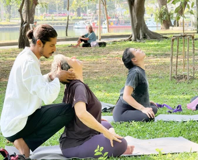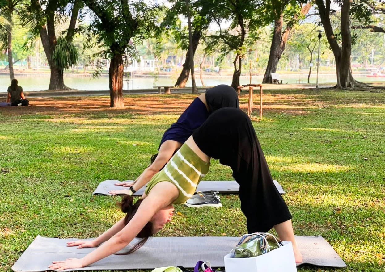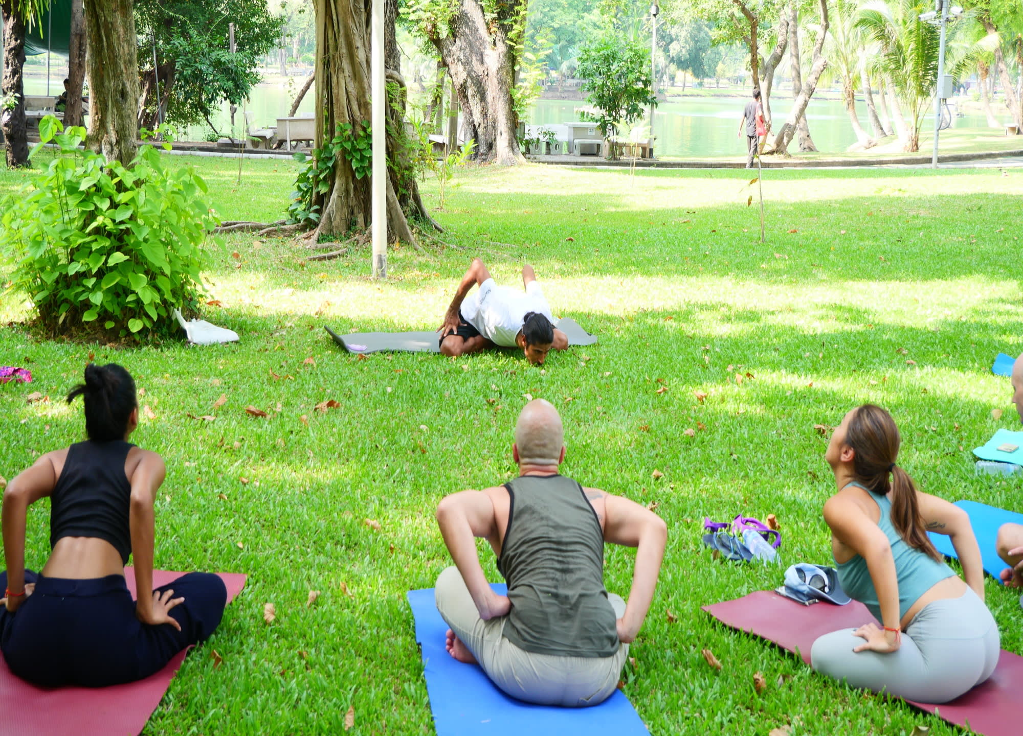 태국 내 가장 유명한 룸피니 공원에서 숙련된 요가 강사에게 요가를 배워보세요.