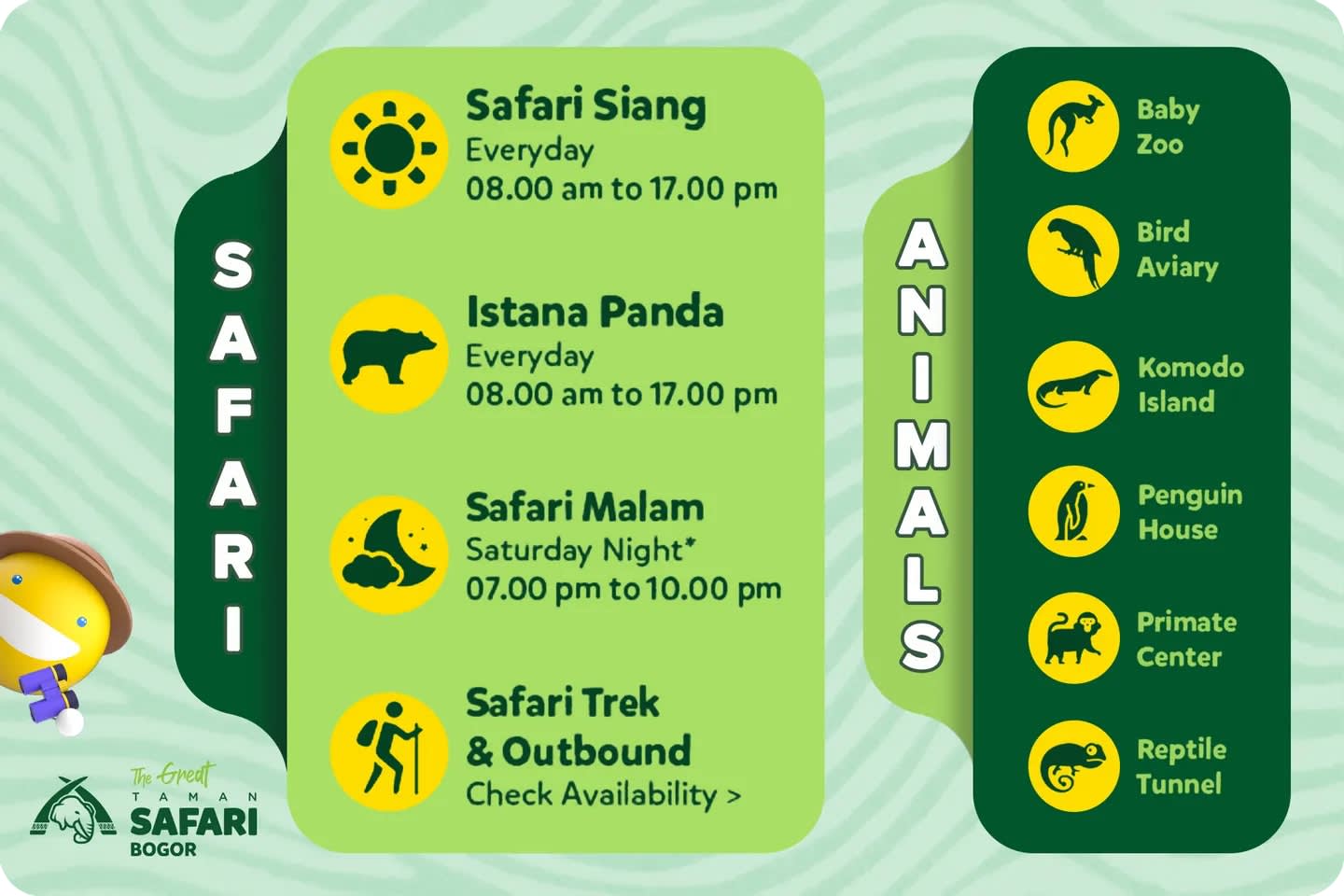 ▶[국제 - 성수기] 주간 사파리 + 판다 - 이용요건 * 아동 티켓은 만 1~5세 방문객에게 유효합니다. * 본 티켓은 KITAS 비소지 외국인에게만 유효합니다. 인도네시아 시민권자에게는 적용되지 않습니다. * 1세 이하 무료 - 추가정보 * 외부 음식물 반입은 불가합니다. * 예약 시 정확한 이메일 주소 또는 핸드폰 번호를 입력해주세요. 입력 오류로 인해 티켓이 전달되지 않을 수 있습니다. * 구매하신 티켓은 일정 변경이 불가합니다. * 구매하신 티켓은 별도로 명시되지 않는 한 환불되지 않습니다. * 타만 사파리 인도네시아는 이용 약관을 준수하지 않는 방문객의 입장을 거부할 권리가 있습니다. * 전자 티켓은 부분적으로든 전체적으로든 현금으로 교환할 수 없습니다. * 공원을 돌아다니며 희귀 동물을 서식지에서 45분 동안 만날 수 있는 인기 있는 활동 중 하나입니다. 야생 동물을 만나기 위한 기억에 남을 만한 야생 탐험도 즐길 수 있습니다. * 세금이 포함된 가격입니다. * 타만 사파리 인도네시아 보고르 안전 수칙: * 사파리 여행 구역을 운전할 때는 항상 길을 건너는 동물에게 우선권을 주십시오. * 나이트 사파리 방문 중에는 관광 열차에서 내리는 것이 엄격히 금지됩니다. * 지정된 먹이 주기 구역 외에서는 동물에게 먹이를 주거나 창문을 열지 마세요. * 항상 차량 내에 머무르시고 쓰레기를 버리지 마십시오. * 안전하고 즐거운 경험을 위해 항상 경비원의 지시에 따라주세요. * 근무 중인 직원의 지시에 따르세요. * 타만 사파리 인도네시아는 차량 파손 또는 분실에 대해 책임지지 않습니다.