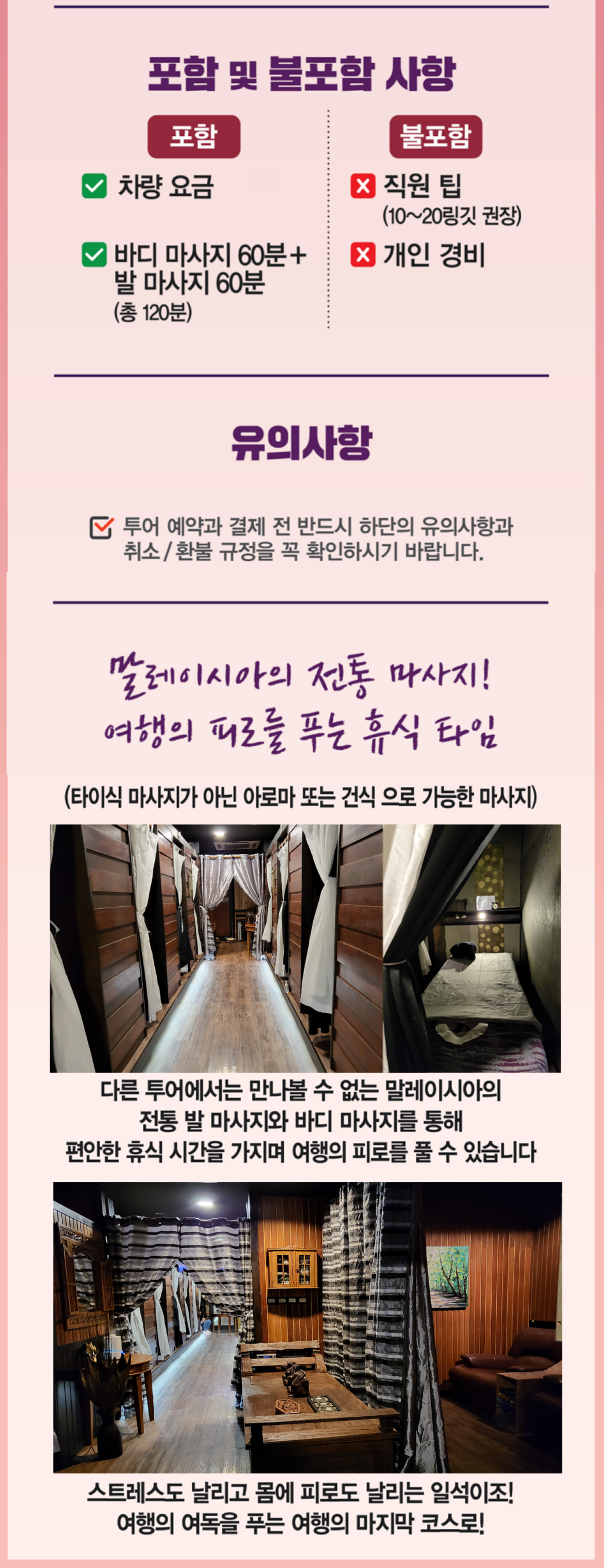 말레이시아의 전통 마사지, 여행의 피로를 푸는 휴식타임으로 여행의 마지막 코스로 제격입니다. 전통 발 마사지와 바디 마사지로 편안한 휴식 시간을 가지며 여행의 피로를 풀 수 있습니다. 프라이빗한 공간에서 편안하고 안락하게, 동반 자녀가 있어도 함께 받을 수 있고, 마사지하지 않은 아동은 편안한 휴게 공간에서 대기할 수 있습니다.