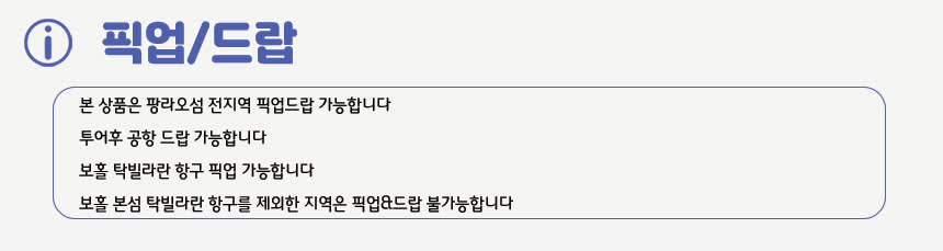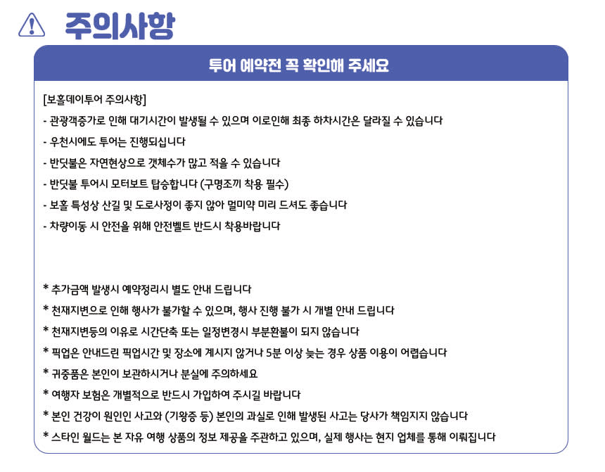 [보홀데이투어 주의사항] - 관광객증가로 인해 대기시간이 발생될 수 있으며 이로인해 최종 하차시간은 달라질 수 있습니다 - 우천시에도 투어는 진행되십니다 - 반딧불은 자연현상으로 갯체수가 많고 적을 수 있습니다 - 반딧불 투어시 모터보트 탑승합니다 (구명조끼 착용 필수) - 보홀 특성상 산길 및 도로사정이 좋지 않아 멀미약 미리 드셔도 좋습니다 - 차량이동 시 안전을 위해 안전벨트 반드시 착용바랍니다 * 추가금액 발생시 예약정리시 별도 안내 드립니다 * 천재지변으로 인해 행사가 불가할 수 있으며, 행사 진행 불가 시 개별 안내 드립니다 * 천재지변등의 이유로 시간단축 또는 일정변경시 부분환불이 되지 않습니다 * 픽업은 안내드린 픽업시간 및 장소에 계시지 않거나 5분 이상 늦는 경우 상품 이용이 어렵습니다 * 귀중품은 본인이 보관하시거나 분실에 주의하세요 * 여행자 보험은 개별적으로 반드시 가입하여 주시길 바랍니다 * 본인 건강이 원인인 사고와 (기왕증 등) 본인의 과실로 인해 발생된 사고는 당사가 책임지지 않습니다 * 스타인 월드는 본 자유 여행 상품의 정보 제공을 주관하고 있으며, 실제 행사는 현지 업체를 통해 이뤄집니다