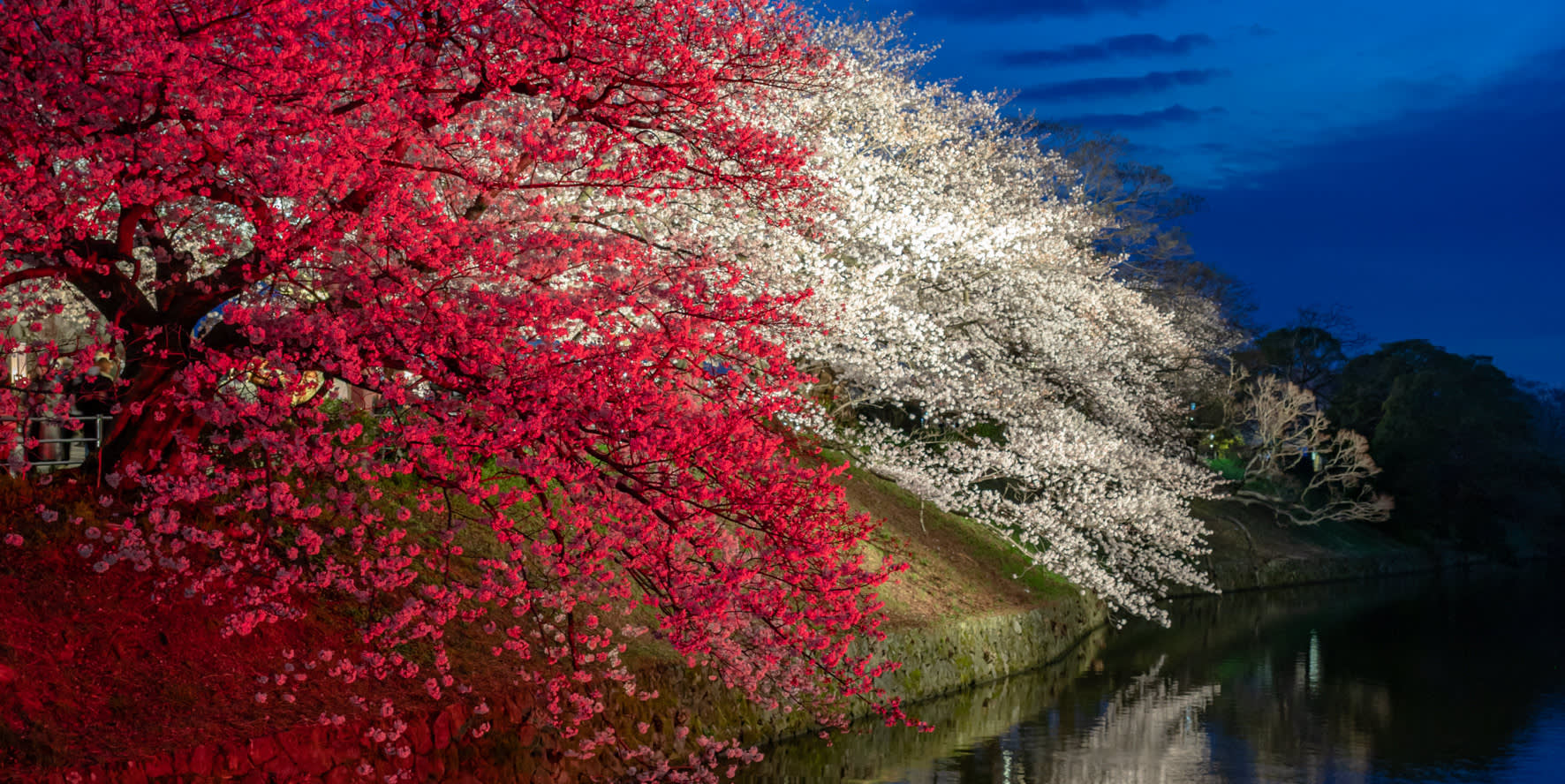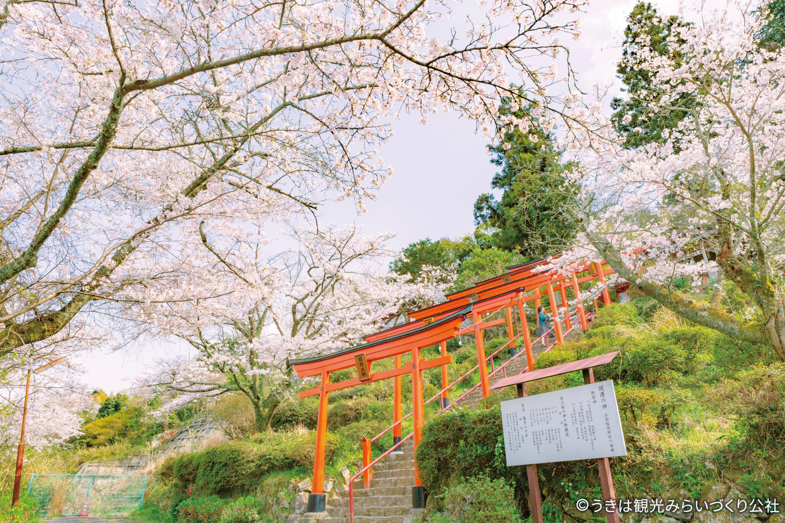 다음으로는 강을 따라 뻗어 있는 나가레카와 벚꽃 가로수길로 갑니다. 강 양쪽에 만개한 벚꽃은 분홍색 산책로를 형성하며 경치가 넓고 인파가 많지 않아 여유롭게 사진을 찍고 벚꽃이 만개한 순간을 즐기기에 좋습니다. 그 후 우키하 이나리 신사로 이동합니다. 붉은색 도리이가 비탈길을 따라 늘어서 있으며 벚꽃과 자연 경관이 어우러져 경쾌한 느낌을 더하며 여정에서 변화가 가득한 곳입니다.