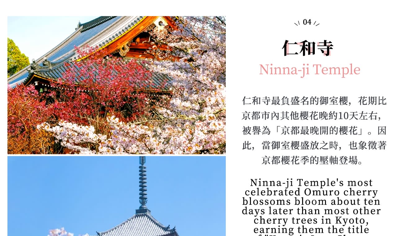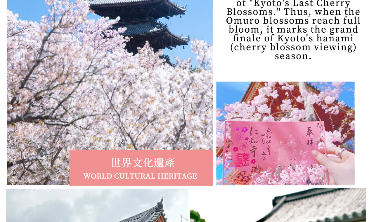 * 세계문화유산인 니나지 절에 가서 교토에서 가장 늦게 피는 오무로 벚꽃을 감상하세요. 키가 작고 친근한 꽃이 피어 아름다운 벚꽃을 가까이에서 촬영할 수 있습니다.