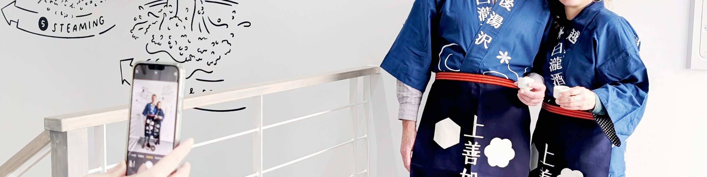 * WSET 레벨 3 인증을 받은 양조장 가이드의 안내를 받아 나만의 맞춤 사케 블렌드를 만들게 됩니다. 블렌드의 개성을 반영하는 한자 문자를 라벨에 그려 병을 완성하세요.