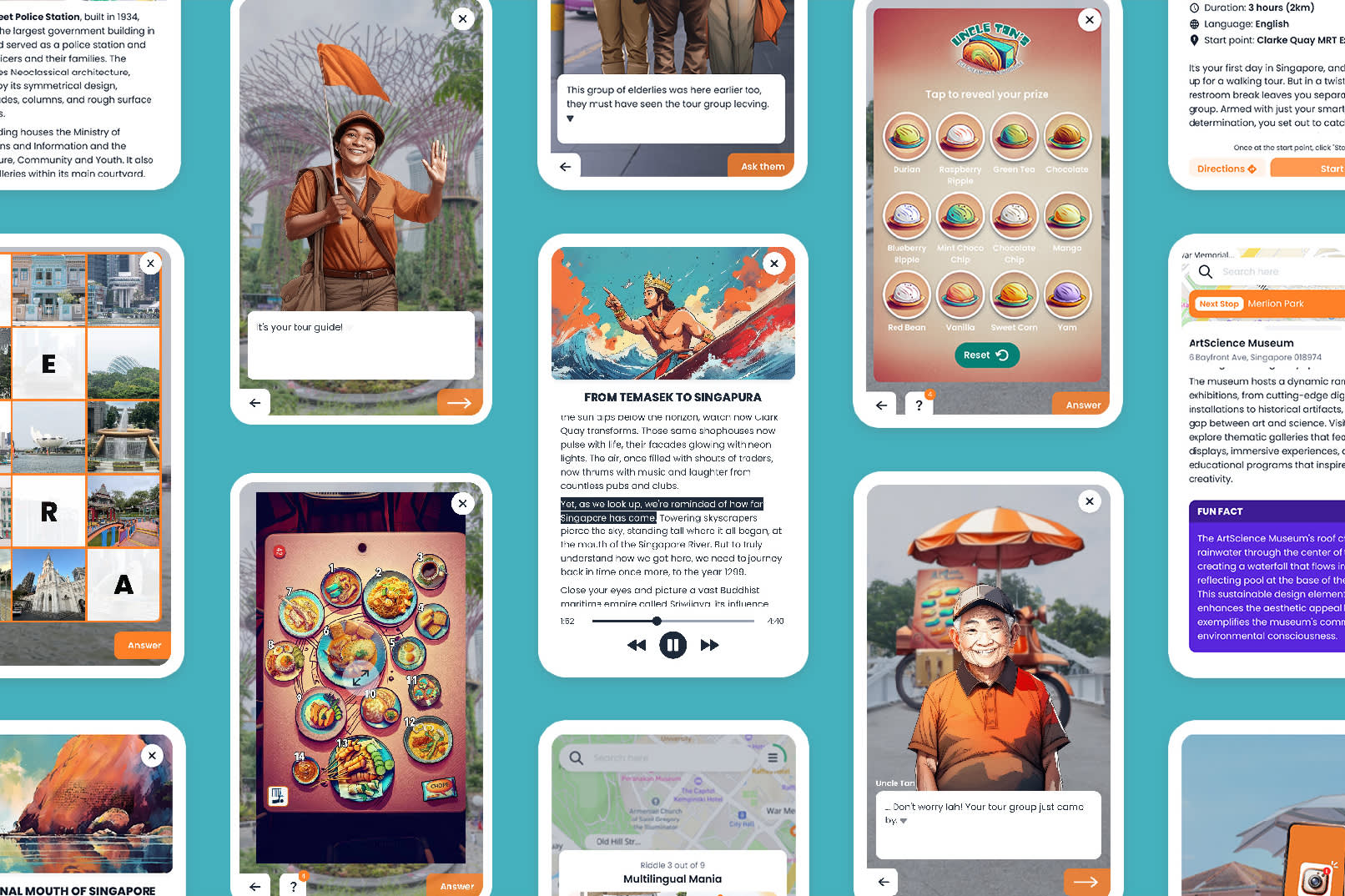 잊을 수 없는 특별한 모험 특별한 어드벤처 게임과 함께 싱가포르의 아름다운 명소를 탐험하는 셀프 가이드 투어를 떠나보세요. 싱가포르 리버, 시빅디스트릭트, 마리나베이를 거닐며 다음 장소로 안내하는 흥미진진한 수수께끼를 풀어보세요. 각 퍼즐을 풀 때마다 스릴 넘치는 도시 어드벤처의 주인공이 되어 장대한 스토리를 완성할 수 있습니다.