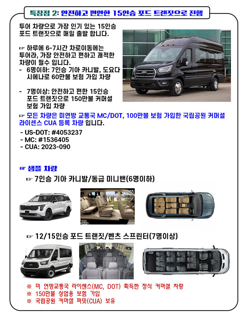 2026년 미국 국립공원 입장료 변경 미국 국립공원 관리청(NPS)은 2026년 1월 1일부터 외국인 관광객을 대상으로 한 입장료 체계를 대폭 개편한다고 발표했습니다. ☞ 적용 대상 미국을 방문한 외국인 관광객(만 16세이상) 외국인 관광객이리도 만 15세이하는 무료. - 미국 시민 및 영주권자에게는 기존 혜택을 유지 합니다. ☞ 인기 국립공원 11곳 ‘외국인 할증료’ 도입 기존 차량당 입장료외에 1인당 $100의 할증료를 추가로 내야 합니다. 해당 공원: 그랜드캐년, 요세미티, 옐로스톤, 자이언캐년, 브라이스캐년, 글레이셔, 그랜드티턴, 로키 마운틴, 아카디아, 에버글레이즈, 세쿼이아·킹스캐년 ※ 2026년 1월 1일이후 국립공원 입장료 지불 변경 커머셜 차량 입장료($45/인)는 불포함 사항과 동일하게 담당 가이드에게 지불하시면 됩니다. 새롭게 추가 지불하는 외국인 국립공원 입장료는 여행객 본인이 직접 지불하시면 됩니다.(단, 만 15세이하는 무료 입니다.) * 미국 시민권자와 영주권자는 신분증만 준비해서 제시하시면 됩니다.(추가 입장료 없음) * 외국인 여행객은 외국인 연간패스(America the Beautiful Non-Resident Annual Pass $250)를 구입해서 제시하면 됩니다. 단) 외국인 연간패스를 소지한 본인과 16세이상 외국인 여행객 3명까지 요금을 면제해 줍니다. 💡 팁: 외국인이 위 공원 중 두 곳 이상을 방문할 계획이라면, $250짜리 연간 패스를 구매하는 것이 경제적입니다. 아니면 외국인 여행객은 국립공원마다 $100/인을 지불해야 합니다.