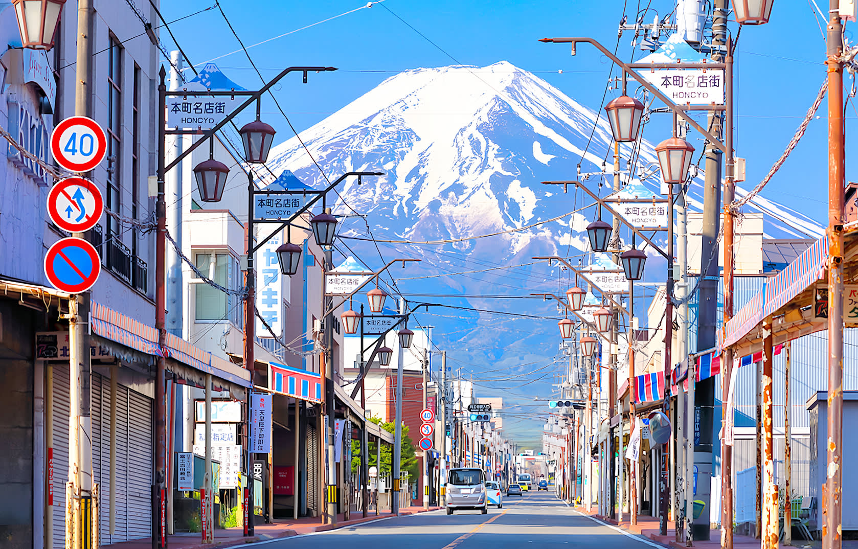* 네 번째 코스: 아마가이 료쿠도・닛카와 시계점. 후지산 전경과 일본풍의 거리 풍경이 완벽하게 조화를 이룹니다.