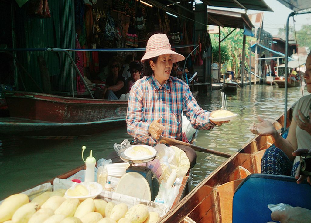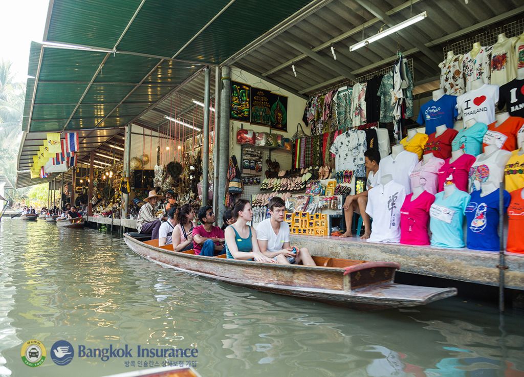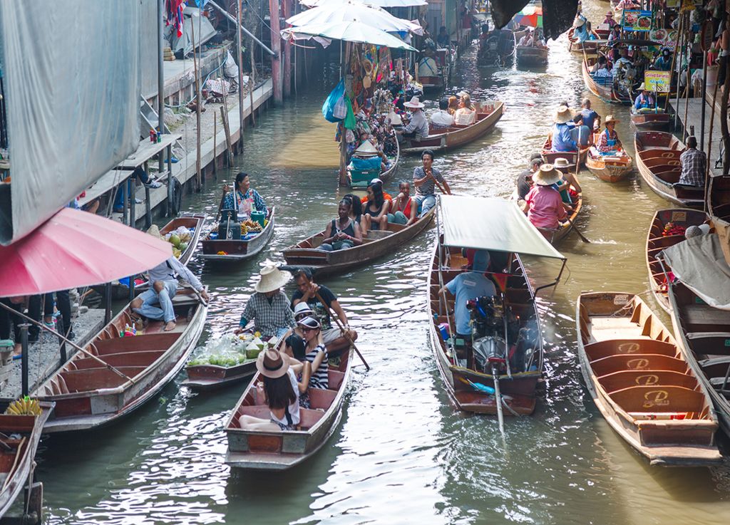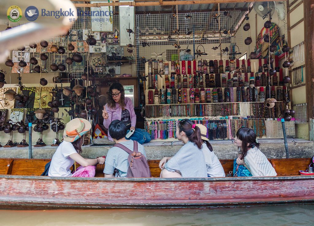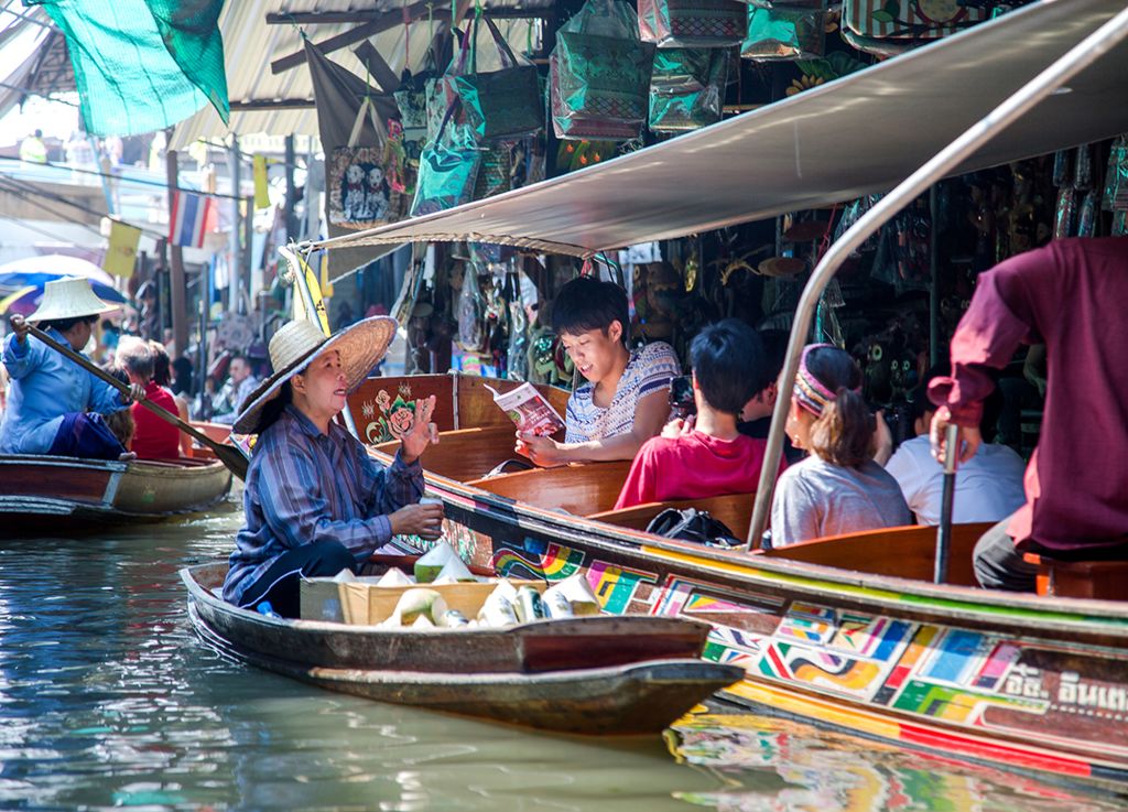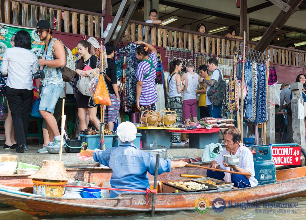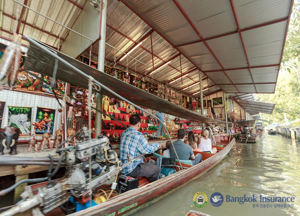 다양한 음식과 기념품을 배에 싣고 파는 상인들의 모습을 볼 수 있는 담넌사두억 수상 시장과
