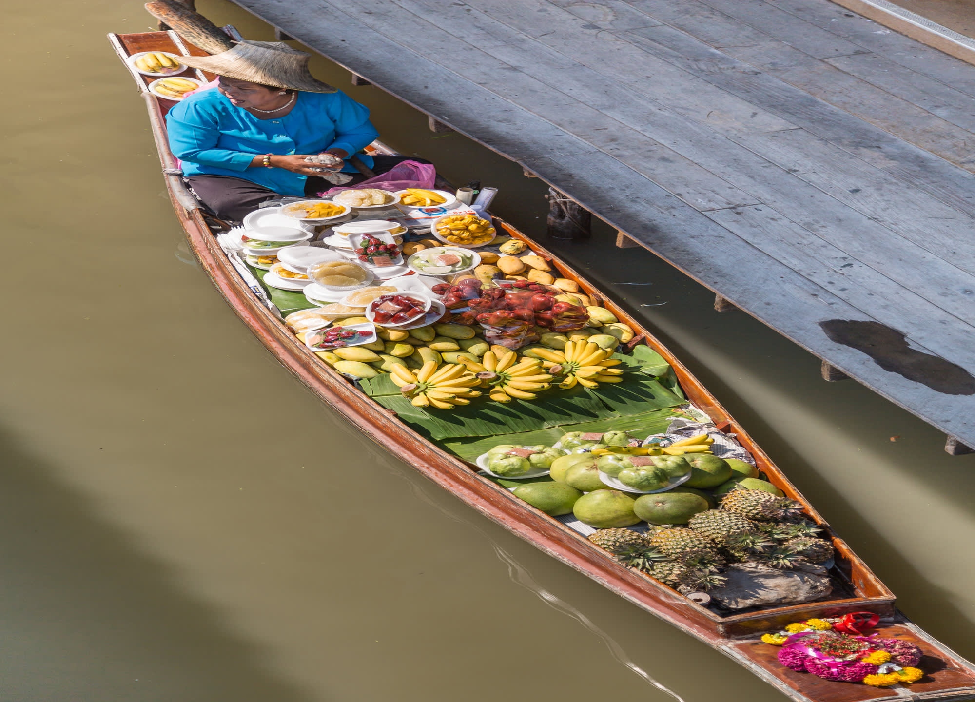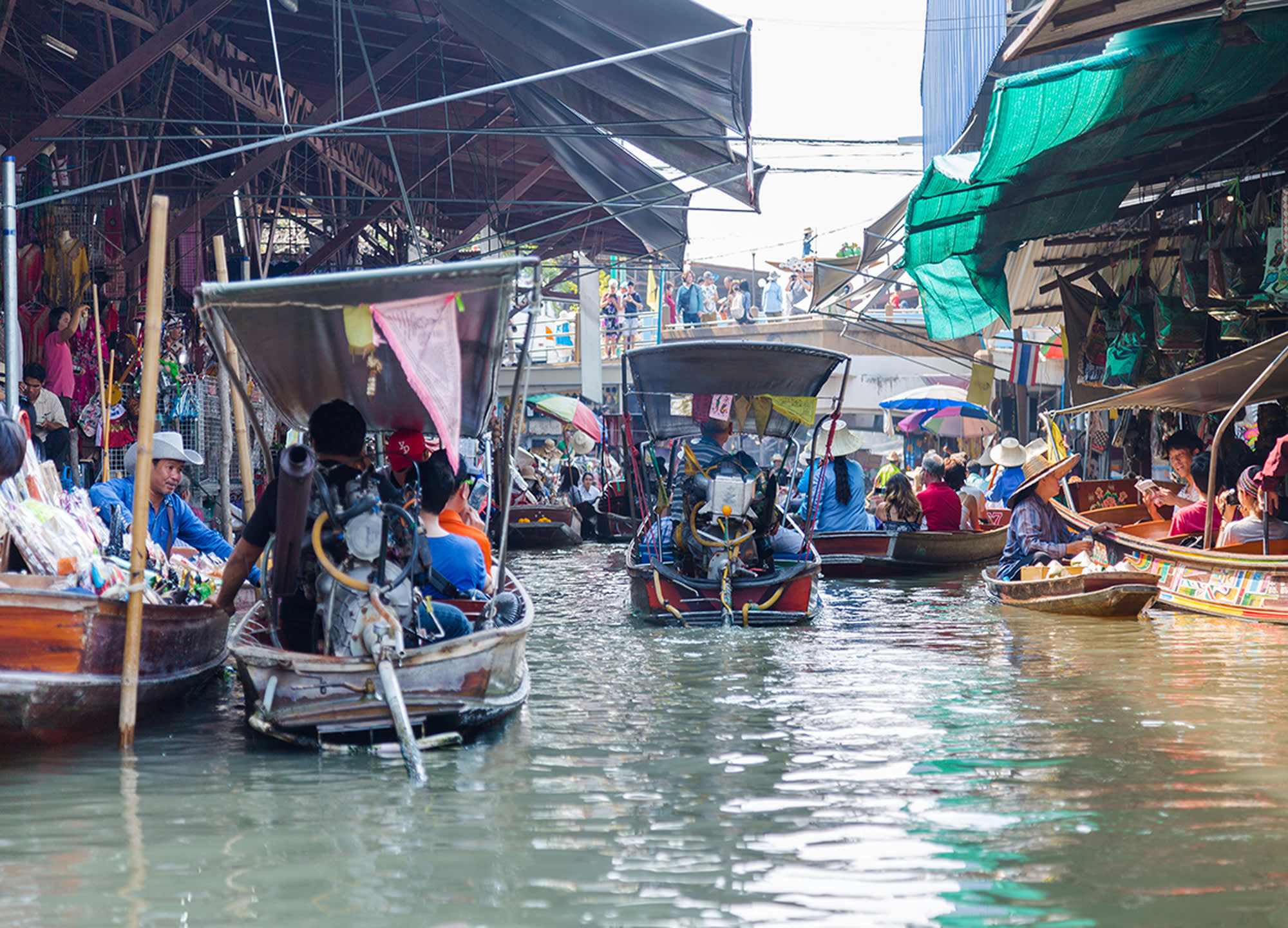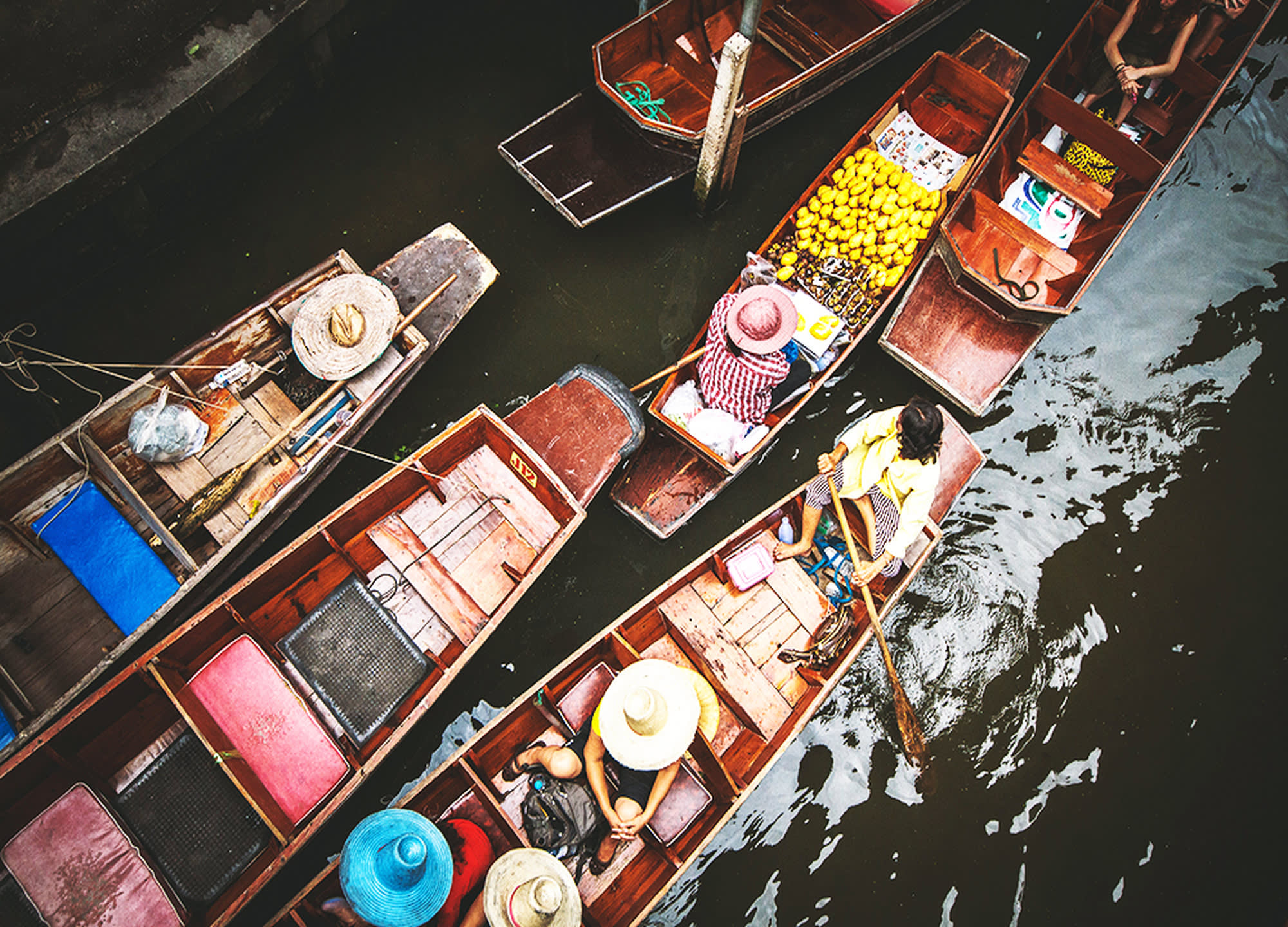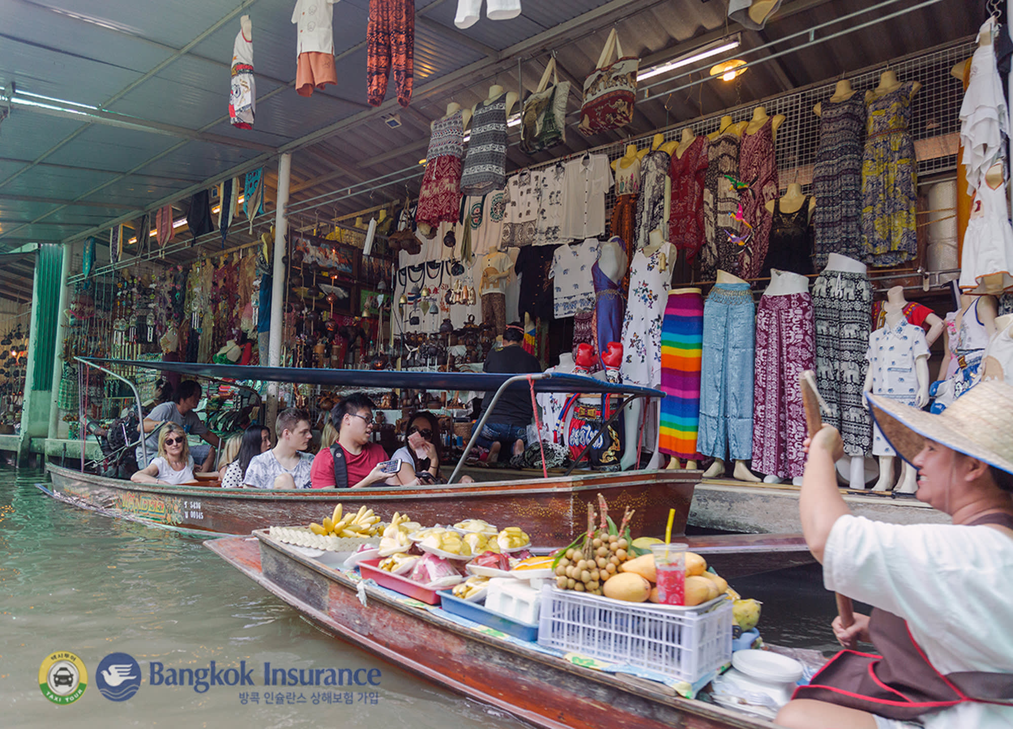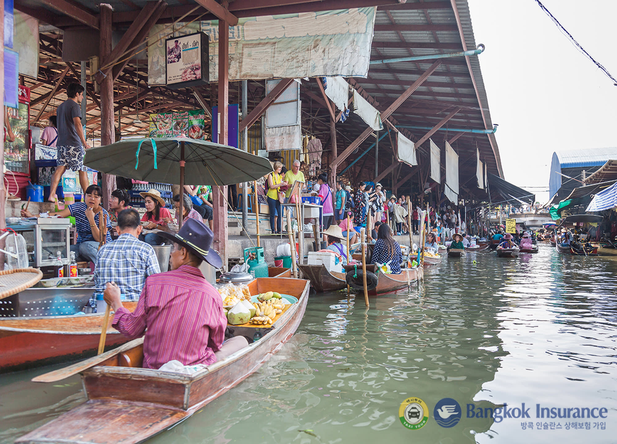 다양한 음식과 기념품을 배에 싣고 파는 상인들의 모습을 볼 수 있는 담넌사두억 수상 시장과