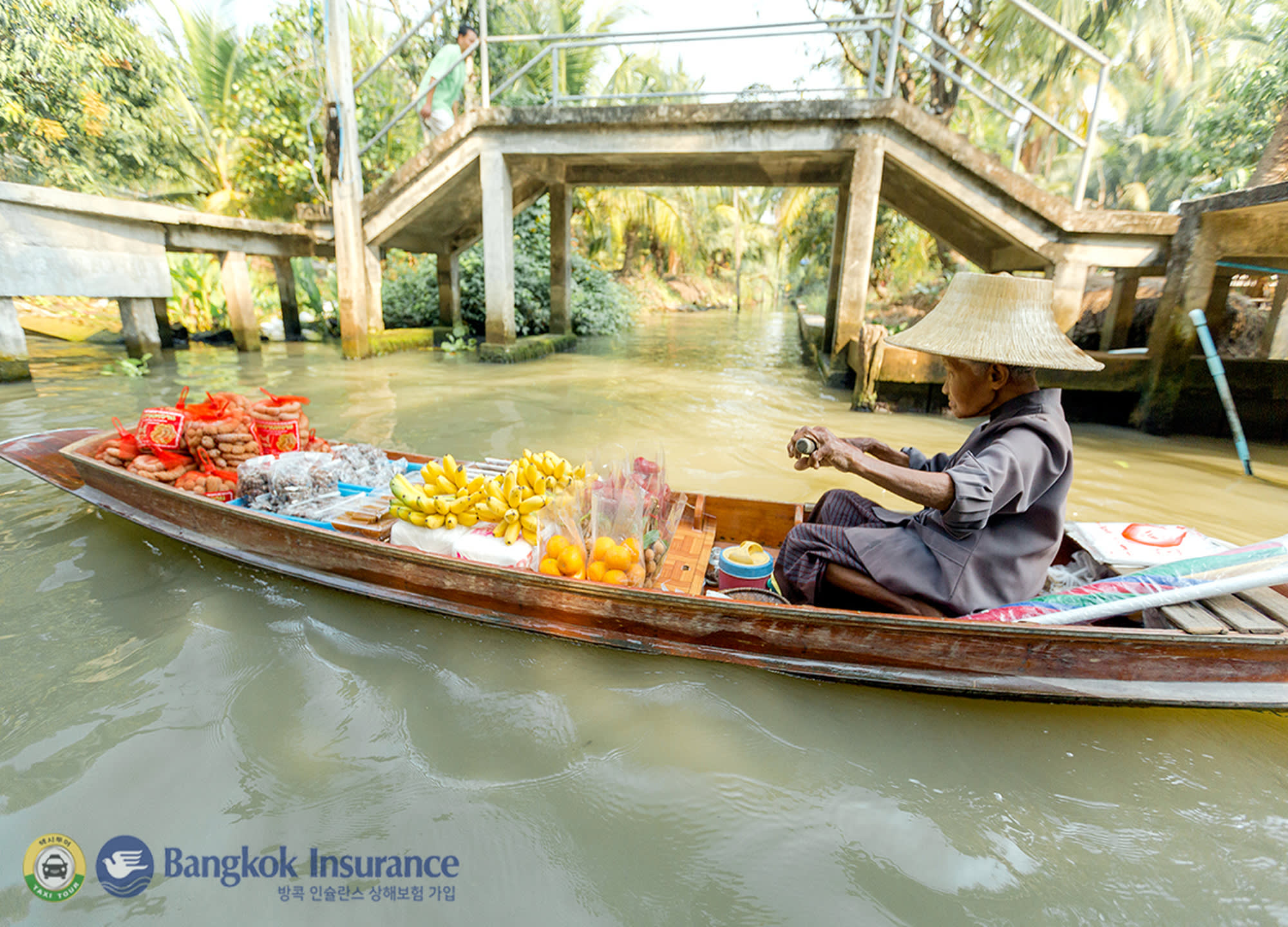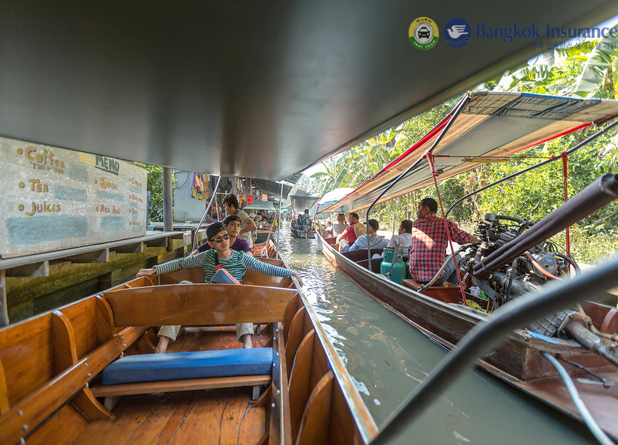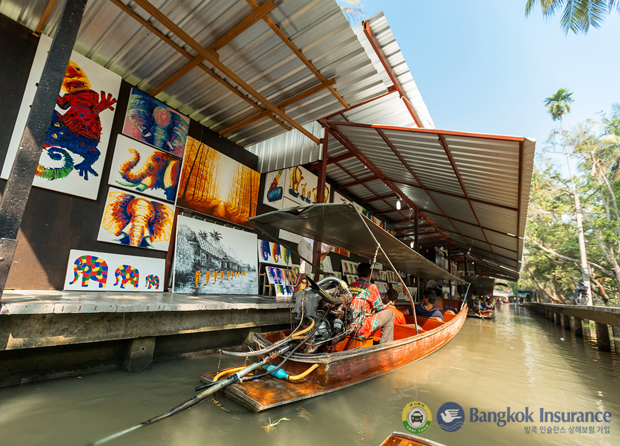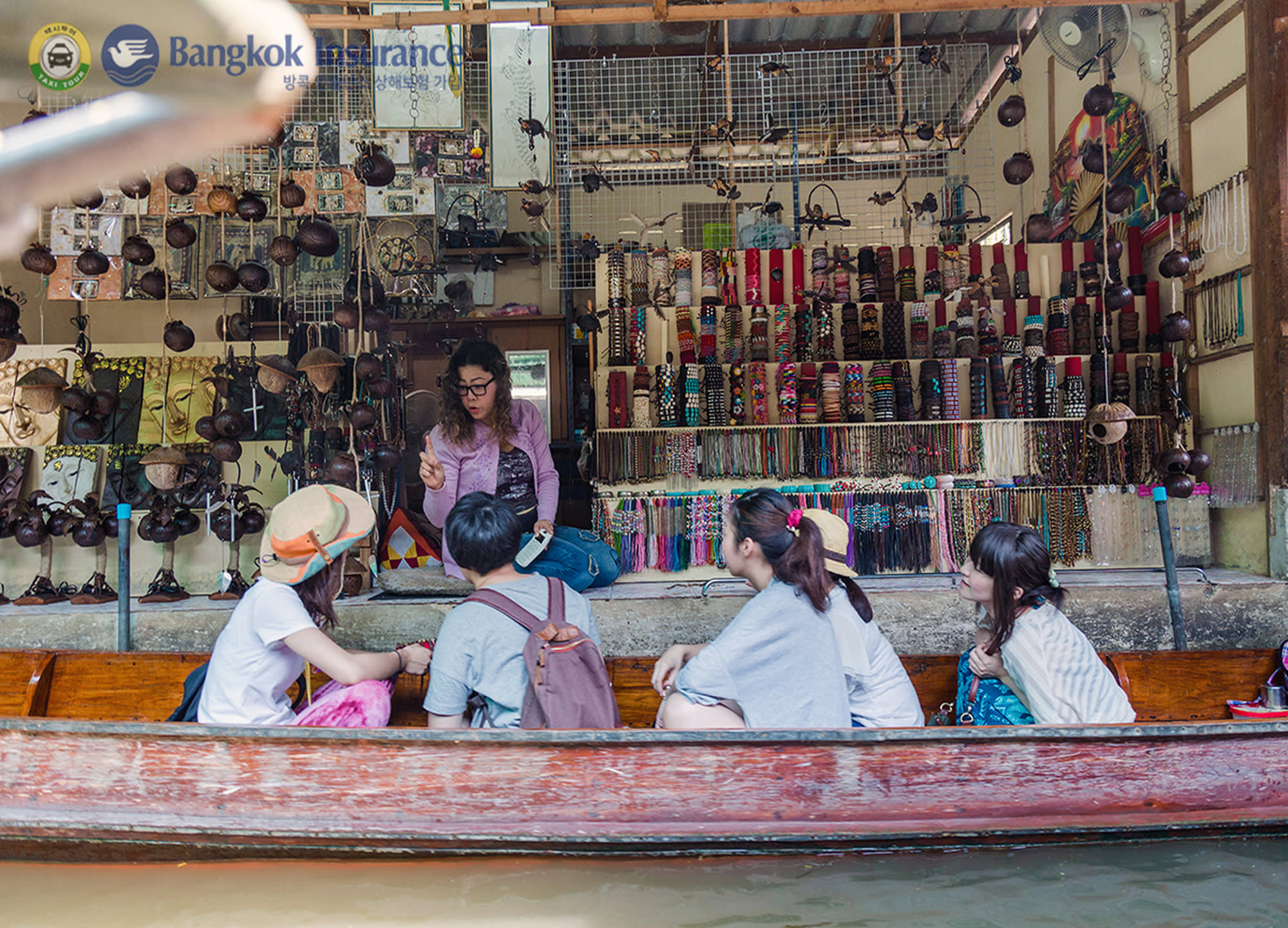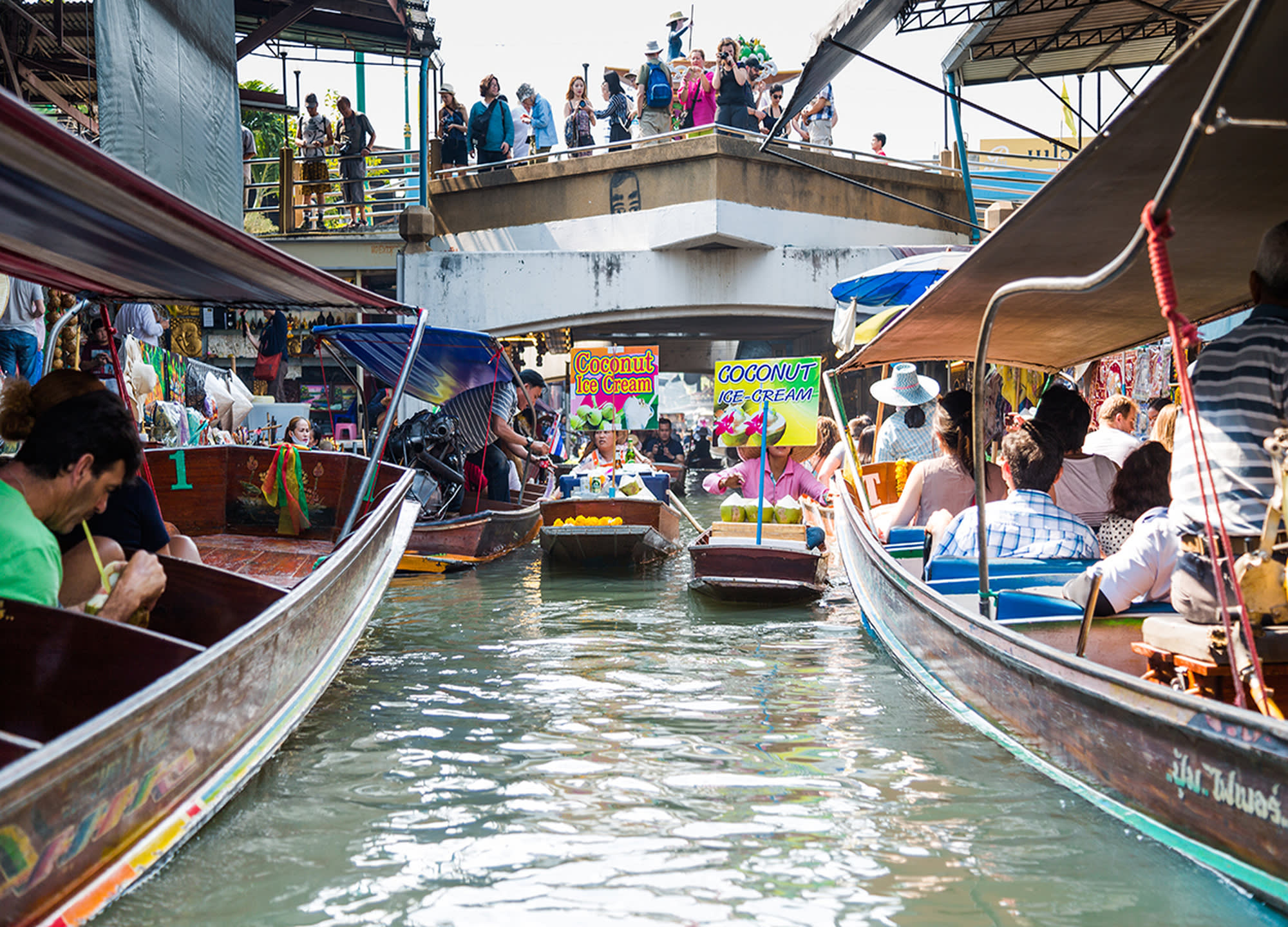 다양한 음식과 기념품을 배에 싣고 파는 상인들의 모습을 볼 수 있는 담넌사두억 수상 시장과