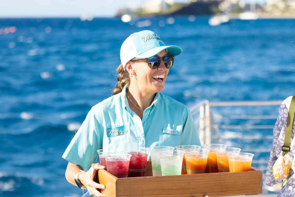오픈 바에서 맥주, 칵테일 또는 청량음료를 즐기며 계절에 따라 상쾌한 무역풍을 타고 카아나팔리로 돌아오는 4시간 동안의 열대 어드벤처를 즐겨보세요.
