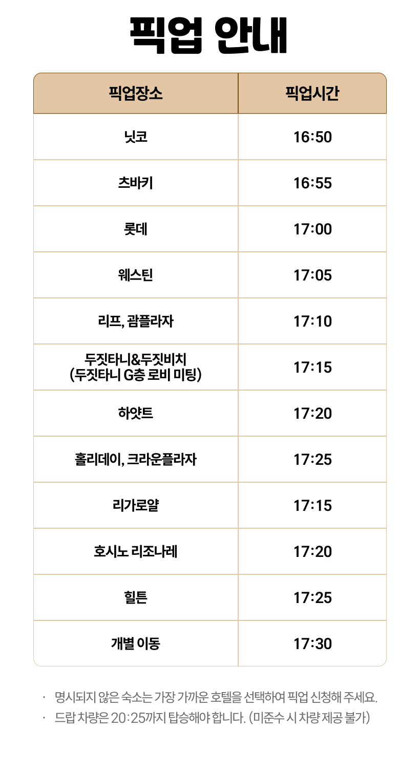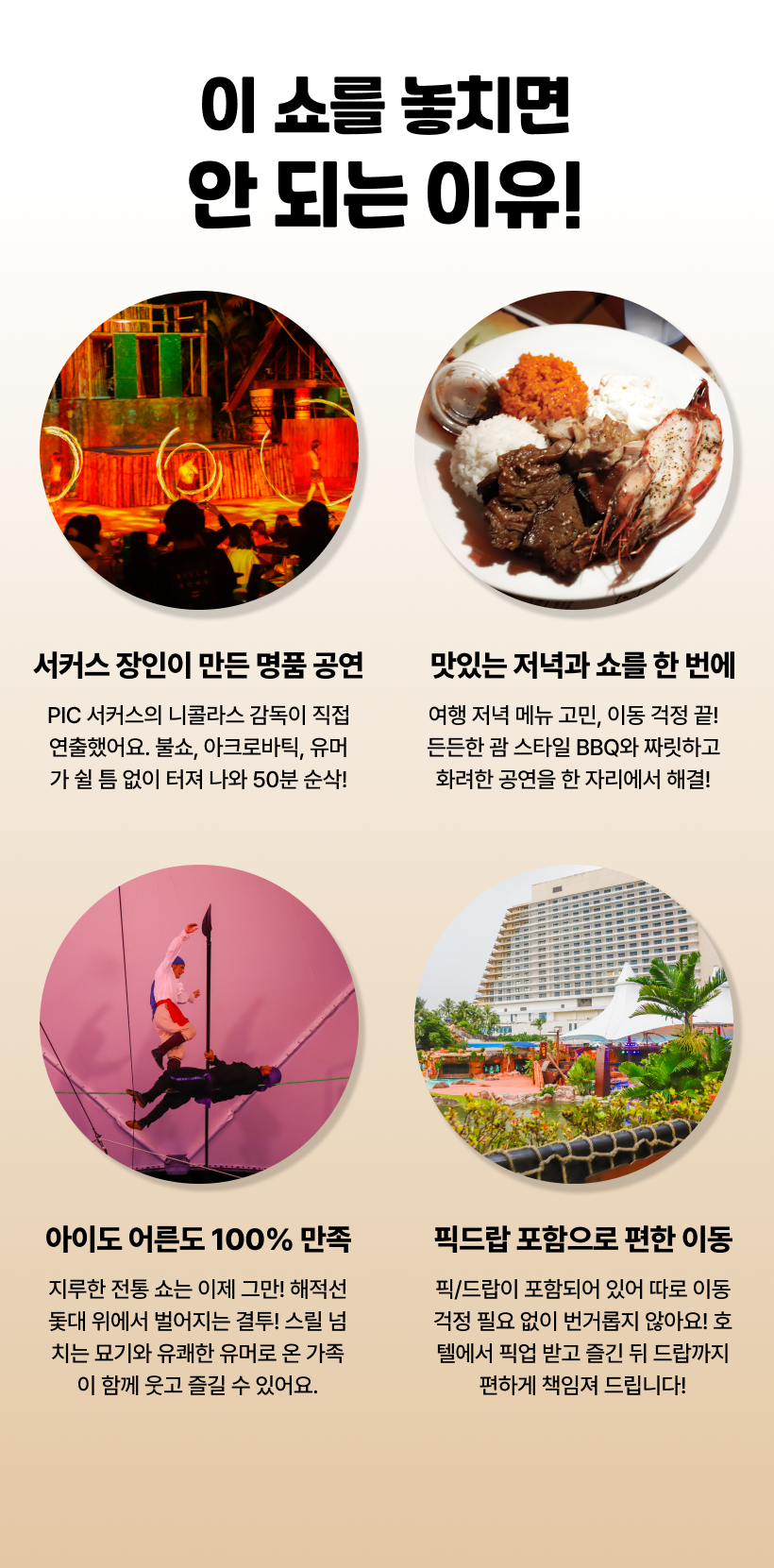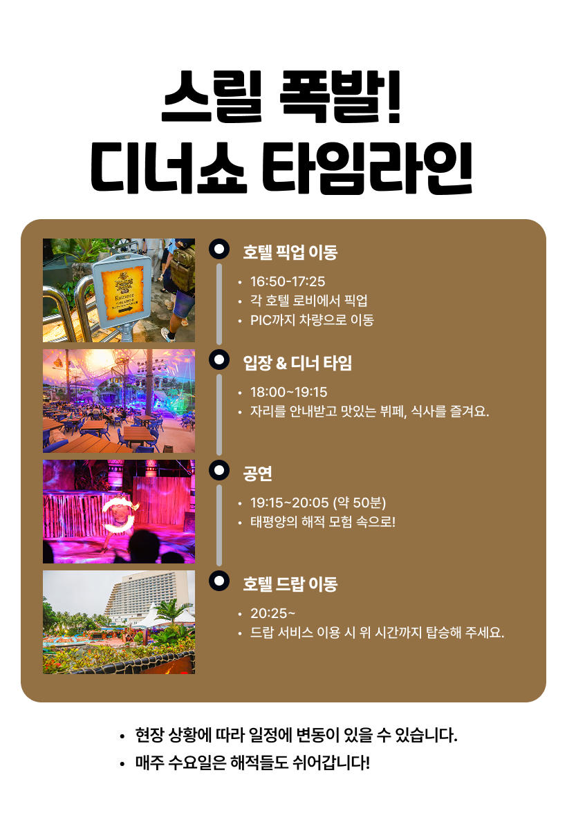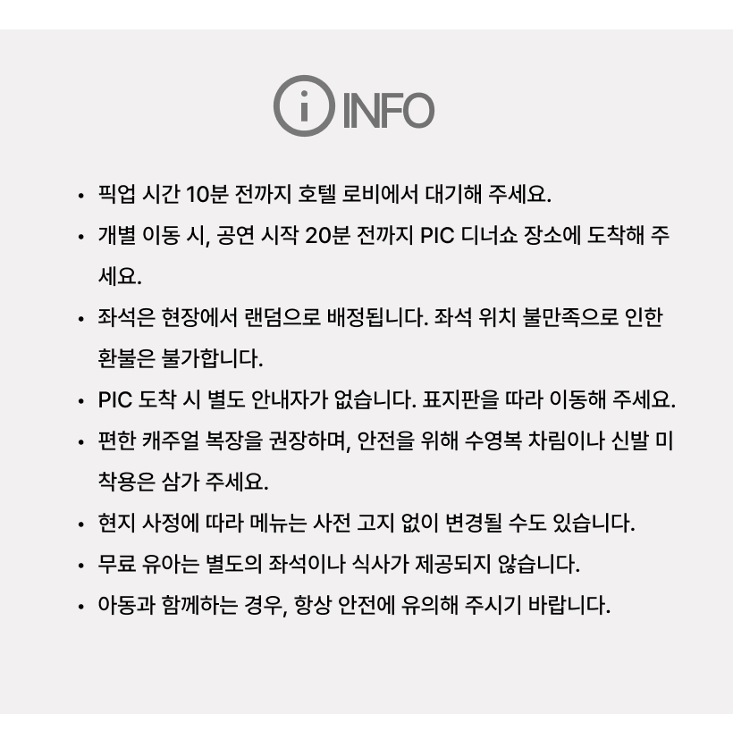 - 픽업 시간 10분 전까지 호텔 로비에서 대기해 주세요. - 개별 이동 시, 공연 시작 20분 전까지 PIC 디너쇼 장소에 도착해 주세요. - 좌석은 현장에서 랜덤으로 배정됩니다. 좌석 위치 불만족으로 인한 환불은 불가합니다. - PIC 도착 시 별도 안내자가 없습니다. 표지판을 따라 이동해 주세요. - 편한 캐주얼 복장을 권장하며, 안전을 위해 수영복 차림이나 신발 미착용은 삼가 주세요. - 현지 사정에 따라 메뉴는 사전 고지 없이 변경될 수도 있습니다. - 무료 유아는 별도의 좌석이나 식사가 제공되지 않습니다. - 아동과 함께하는 경우, 항상 안전에 유의해 주시기 바랍니다. - 현지 투어 이용시 문제가 발생했을 경우 즉각 해당 업체에 연락을 취해 조치를 받으시기 바랍니다. - 해외여행 중 만일의 경우에 대비해 여행자보험 가입을 권장합니다.