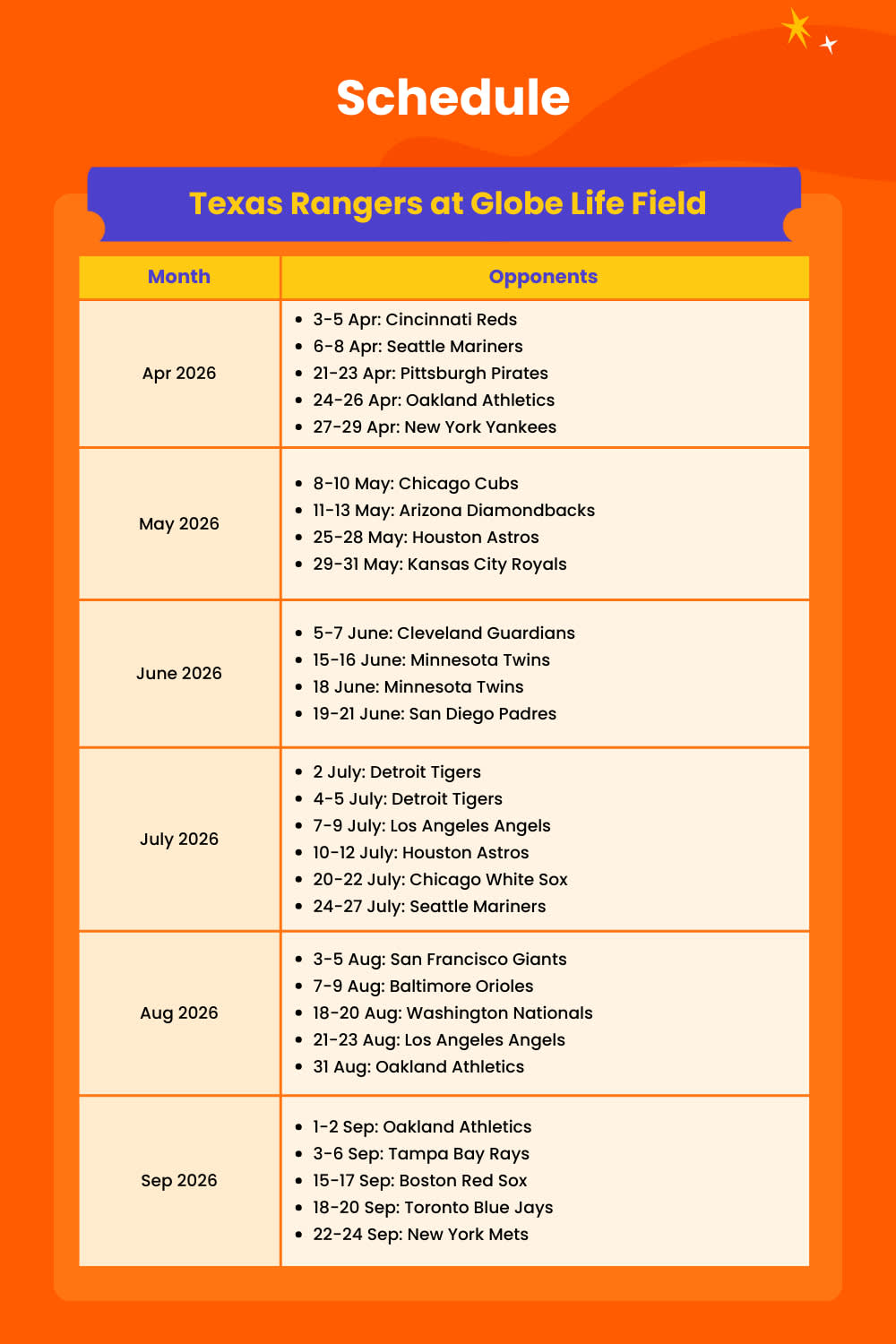 혼자 여행하든, 친구나 사랑하는 사람과 함께하든, 다양한 편의 시설과 엔터테인먼트가 준비되어 있는 텍사스 레인저스 경기 관람은 놓칠 수 없는 특별한 경험입니다!