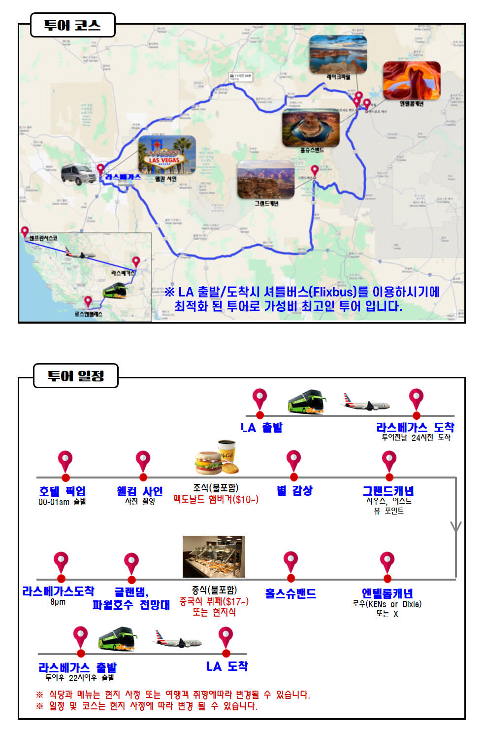 LA에서 출발 라스베가스간 왕복을 대중 교통편으로 이동하고 그랜드캐년과 엔텔롭캐년/홀스슈밴드를 하루에 ! 하루밖에 일정이 없는 여행객을 위해 초스피드, 초저가 1일 투어