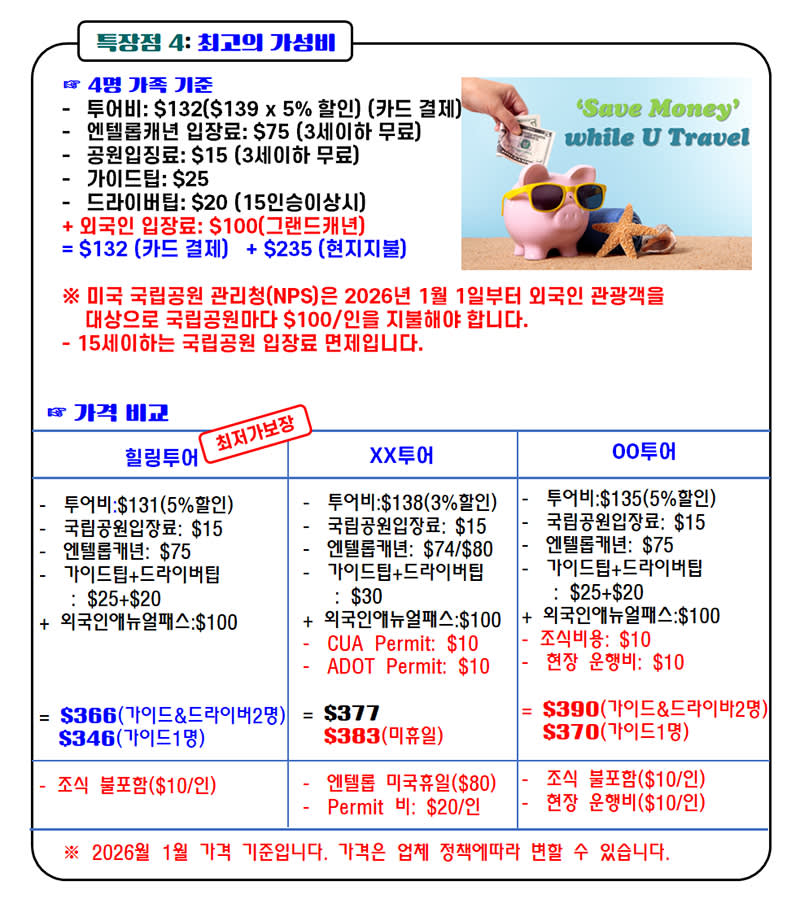 ◆ 픽업 정보 라스베가스 스트립내 호텔(북 스트라토스피어 호텔 ~ 남 만달레이 베이 호텔)에서 픽업해서 00:00~01:00am에 라스베가스를 출발 합니다 ※ 투어 전날 오후 5-6시 사이에 담당 캡틴이 픽업 시간과 장소 컴펌 연락 드립니다. ◆ 2026년 미국 국립공원 입장료 변경 미국 국립공원 관리청(NPS)은 2026년 1월 1일부터 외국인 관광객을 대상으로 한 입장료 체계를 대폭 개편한다고 발표했습니다. ☞ 적용 대상 미국을 방문한 외국인 관광객(만 16세이상) 외국인 관광객이리도 만 15세이하는 무료. - 미국 시민 및 영주권자에게는 기존 혜택을 유지 합니다. ☞ 인기 국립공원 11곳 ‘외국인 할증료’ 도입 기존 차량당 입장료외에 1인당 $100의 할증료를 추가로 내야 합니다. 해당 공원: 그랜드캐년, 요세미티, 옐로스톤, 자이언캐년, 브라이스캐년, 글레이셔, 그랜드티턴, 로키 마운틴, 아카디아, 에버글레이즈, 세쿼이아·킹스캐년 ※ 2026년 1월 1일이후 국립공원 입장료 지불 변경 커머셜 차량 입장료($45/인)는 불포함 사항과 동일하게 담당 가이드에게 지불하시면 됩니다. 새롭게 추가 지불하는 외국인 국립공원 입장료는 여행객 본인이 직접 지불하시면 됩니다.(단, 만 15세이하는 무료 입니다.) * 미국 시민권자와 영주권자는 신분증만 준비해서 제시하시면 됩니다.(추가 입장료 없음) * 외국인 여행객은 외국인 연간패스(America the Beautiful Non-Resident Annual Pass $250)를 구입해서 제시하면 됩니다. 단) 외국인 연간패스를 소지한 본인과 16세이상 외국인 여행객 3명까지 요금을 면제해 줍니다. 💡 팁: 외국인이 위 공원 중 두 곳 이상을 방문할 계획이라면, $250짜리 연간 패스를 구매하는 것이 경제적입니다. 아니면 외국인 여행객은 국립공원마다 $100/인을 지불해야 합니다.