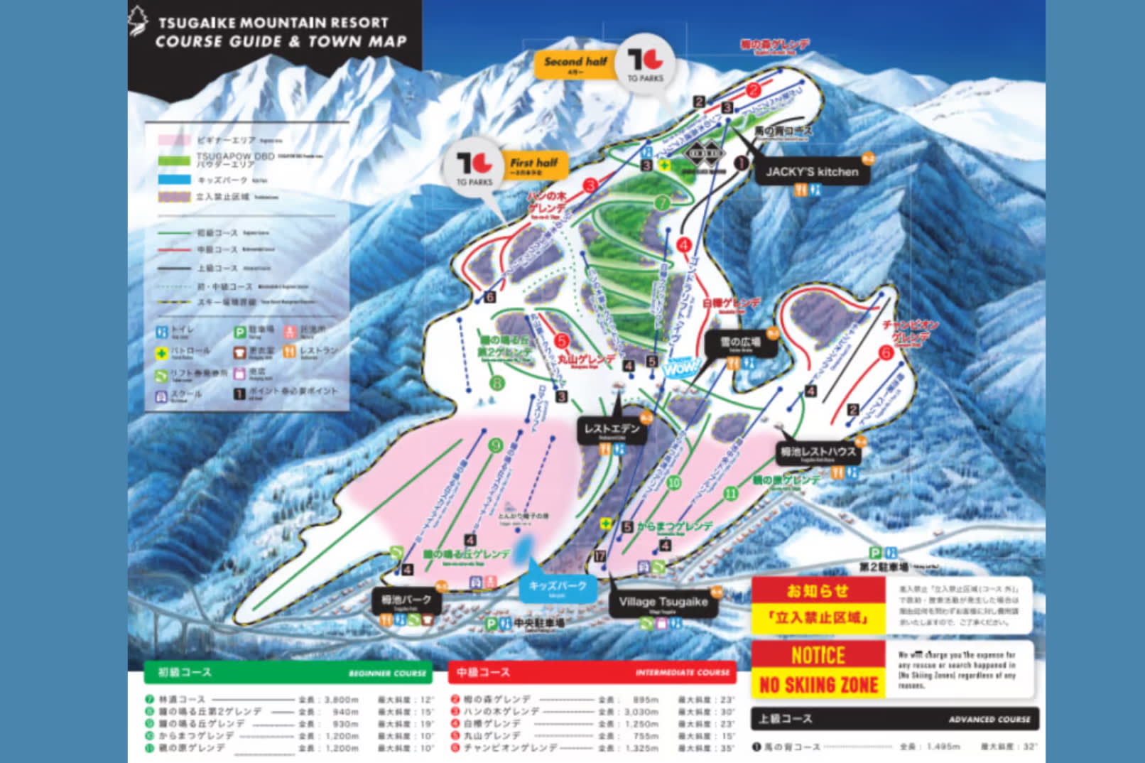 * 츠가이케 마운틴 리조트에서 최대 5,000m 길이의 슬로프와 모든 레벨에 적합한 경사를 즐겨보세요.