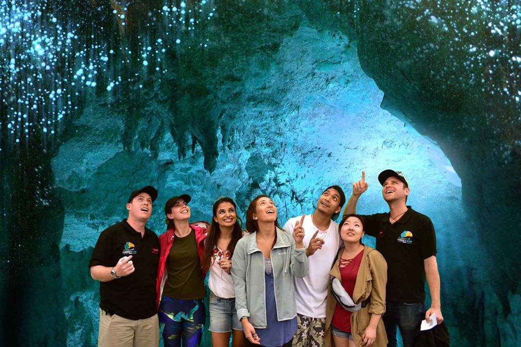 세계적으로 유명한 와이토모 동굴에서 stalagmites와 stalactites를 감상하세요.
