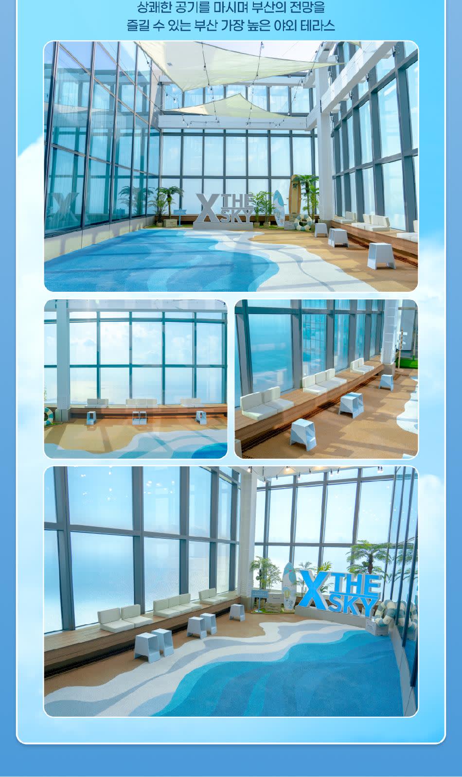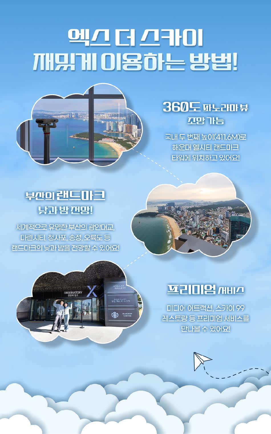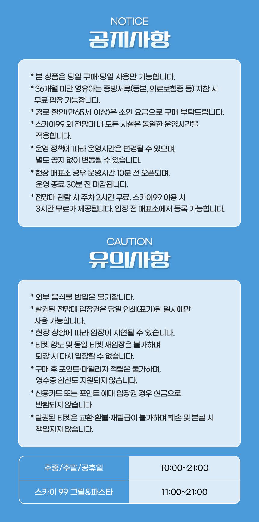 [이용 정보] * 판매기간 : ~ 2026.02.28 * 유효기간 : ~ 2026.02.28 [사용 방법] 이용안내 * 36개월 미만의 유아는 무료입니다. (증빙서류 지참 필요) * 경로(만 65세 이상)는 소인 요금이 적용됩니다. * 부산 엑스 더 스카이 내부 시설 운영 시간은 모두 동일합니다. * 운영 정책에 따라 영업시간이 다소 변경될 수 있으며 변동된 사항은 별도로 공지되지 않을 수 있습니다. * 스카이99 마지막 주문 가능 시간은 운영시간 1시간 전까지 입니다. * 현장 매표소는 영업시간 10분 전에 오픈되며, 당일 현장 티켓의 마지막 발권은 운영시간 마감 30분 전까지입니다. * 전망대 이용객분들은 주차요금 2시간 무료이며 , 레스토랑 이용 시 3시간 무료로 1F 안내데스크에서 확인 받으실 수 있습니다. 유의사항 * 외부 음식물 반입은 모두 금지됩니다. * 전망대 입장은 발권한 티켓에 인쇄(표기)된 날짜와 시간에 한하며, 입장시간 이외는 입장이 제한됩니다. * 현장 상황에 따라 입장이 지연될 수 있습니다. * 동일한 티켓으로 재입장은 불가하며, 타인에게 양도할 수 없습니다. * 신용카드 또는 포인트로 예매한 입장권은 현금으로 반환되지 않습니다. * 발권완료 후에는 교환, 환불 불가합니다. * 티켓의 훼손, 분실에 대해서 책임지지 않으며 재발급은 불가합니다. * 최소 이용 1시간 전 상품구매 * 현장 방문하여 바코드 인증 후 이용 가능