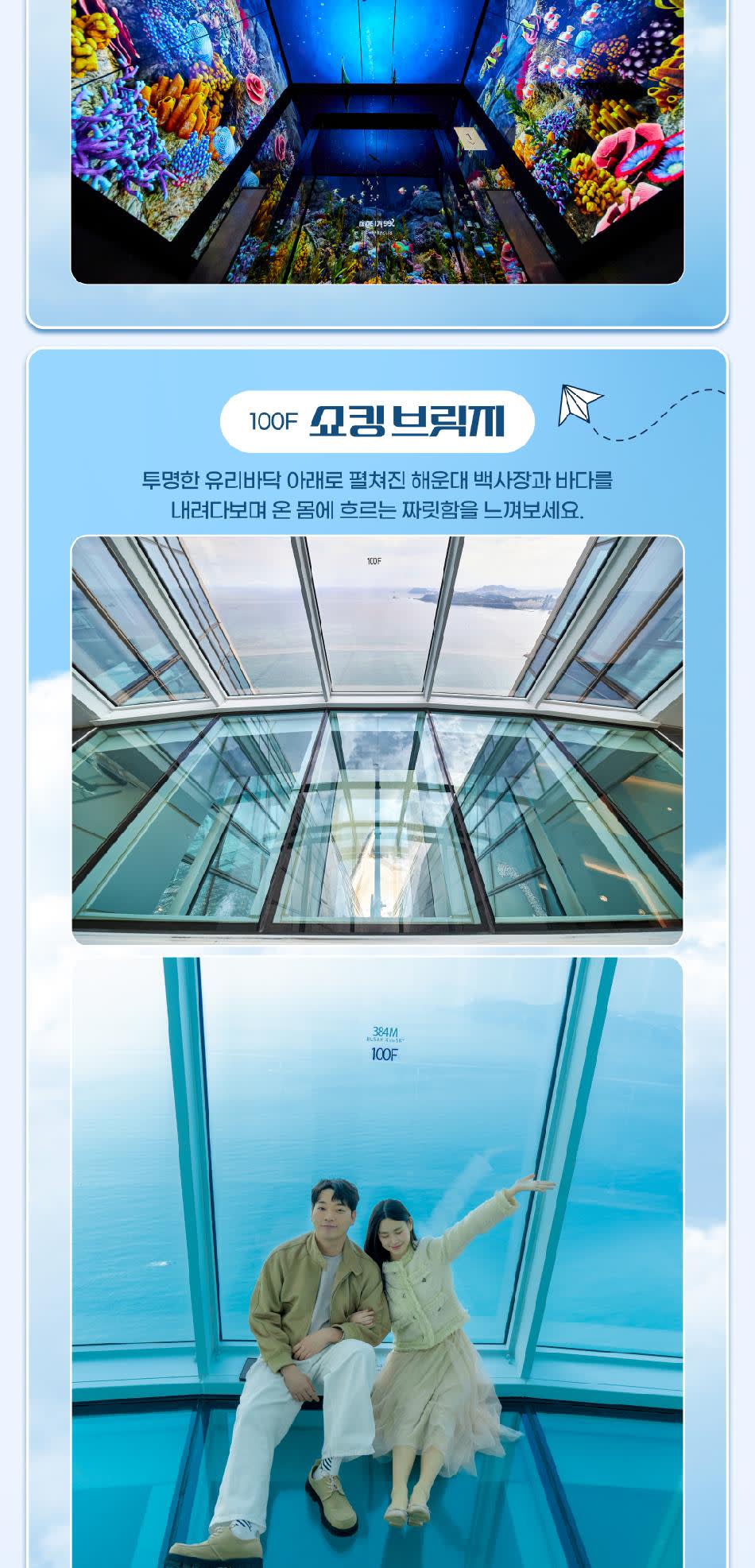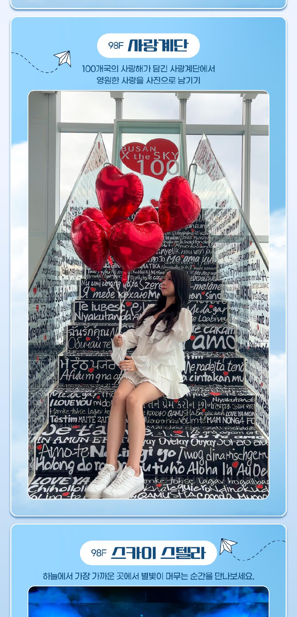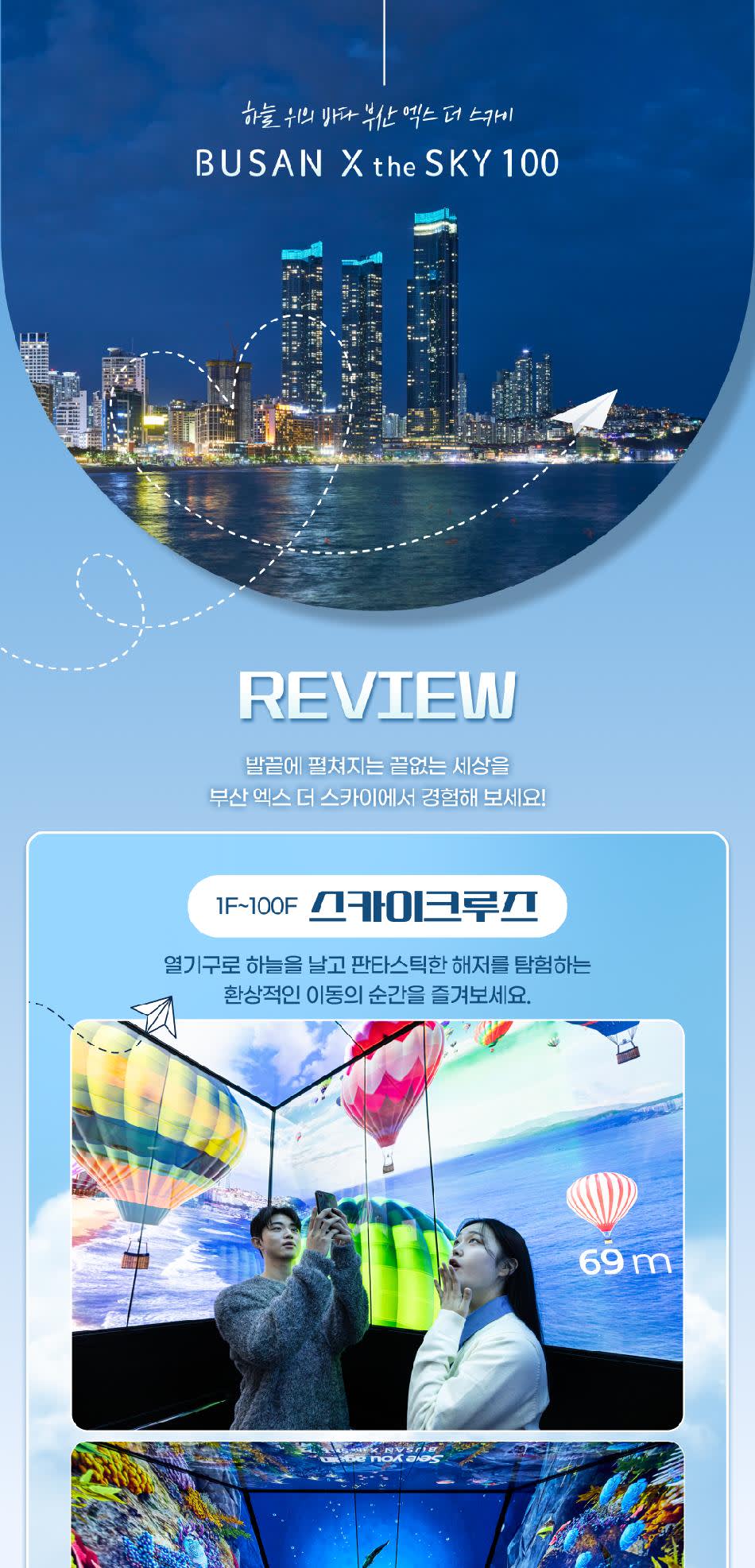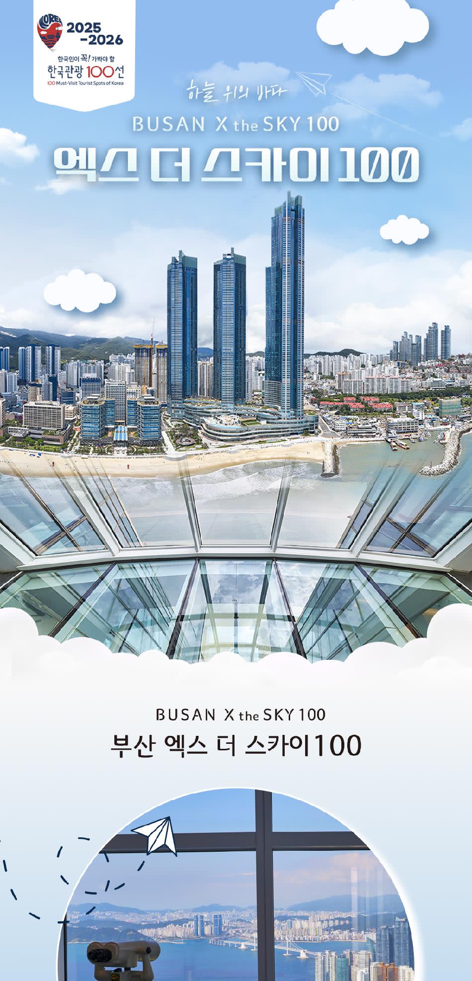 [이용 정보] * 판매기간 : ~ 2026.02.28 * 유효기간 : ~ 2026.02.28 [사용 방법] 이용안내 * 36개월 미만의 유아는 무료입니다. (증빙서류 지참 필요) * 경로(만 65세 이상)는 소인 요금이 적용됩니다. * 부산 엑스 더 스카이 내부 시설 운영 시간은 모두 동일합니다. * 운영 정책에 따라 영업시간이 다소 변경될 수 있으며 변동된 사항은 별도로 공지되지 않을 수 있습니다. * 스카이99 마지막 주문 가능 시간은 운영시간 1시간 전까지 입니다. * 현장 매표소는 영업시간 10분 전에 오픈되며, 당일 현장 티켓의 마지막 발권은 운영시간 마감 30분 전까지입니다. * 전망대 이용객분들은 주차요금 2시간 무료이며 , 레스토랑 이용 시 3시간 무료로 1F 안내데스크에서 확인 받으실 수 있습니다. 유의사항 * 외부 음식물 반입은 모두 금지됩니다. * 전망대 입장은 발권한 티켓에 인쇄(표기)된 날짜와 시간에 한하며, 입장시간 이외는 입장이 제한됩니다. * 현장 상황에 따라 입장이 지연될 수 있습니다. * 동일한 티켓으로 재입장은 불가하며, 타인에게 양도할 수 없습니다. * 신용카드 또는 포인트로 예매한 입장권은 현금으로 반환되지 않습니다. * 발권완료 후에는 교환, 환불 불가합니다. * 티켓의 훼손, 분실에 대해서 책임지지 않으며 재발급은 불가합니다. * 최소 이용 1시간 전 상품구매 * 현장 방문하여 바코드 인증 후 이용 가능