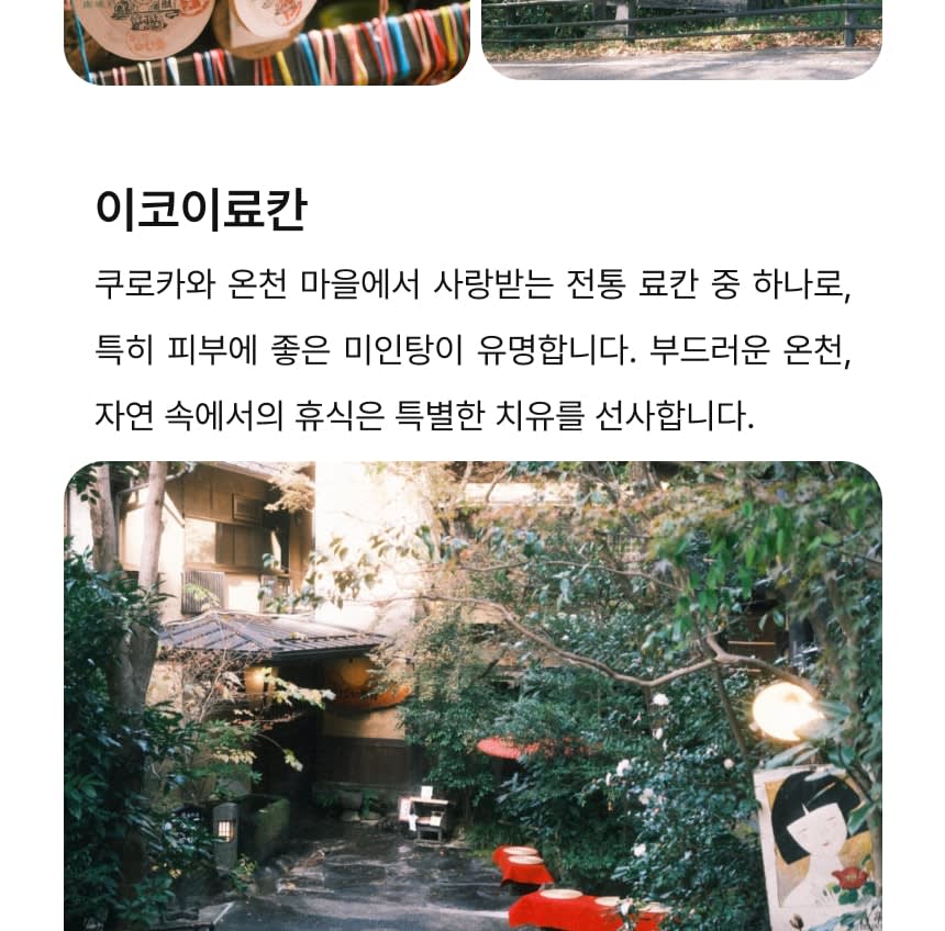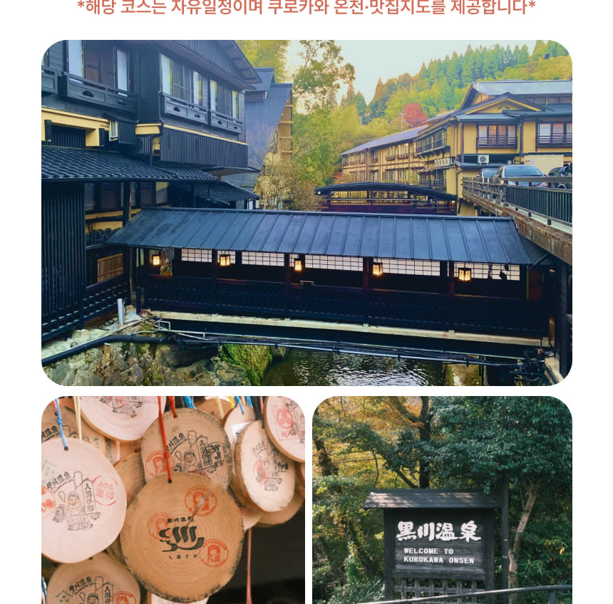 * 13:40 쿠로카와 온천마을 (약 150분) └ 료칸별 노천탕, 동굴탕, 미인탕 체험 가능 (입욕료 별도) └ 가이드 제공 맛집 지도 따라 산책과 식사