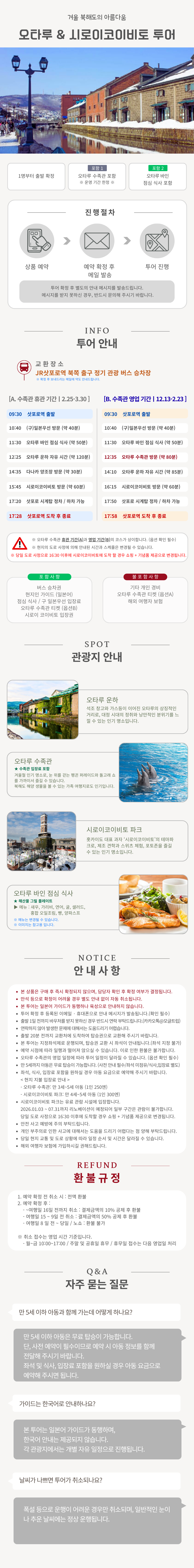 삿포로 근교에서 겨울 홋카이도의 대표 명소를 편하게 즐길 수 있는 일정입니다.
