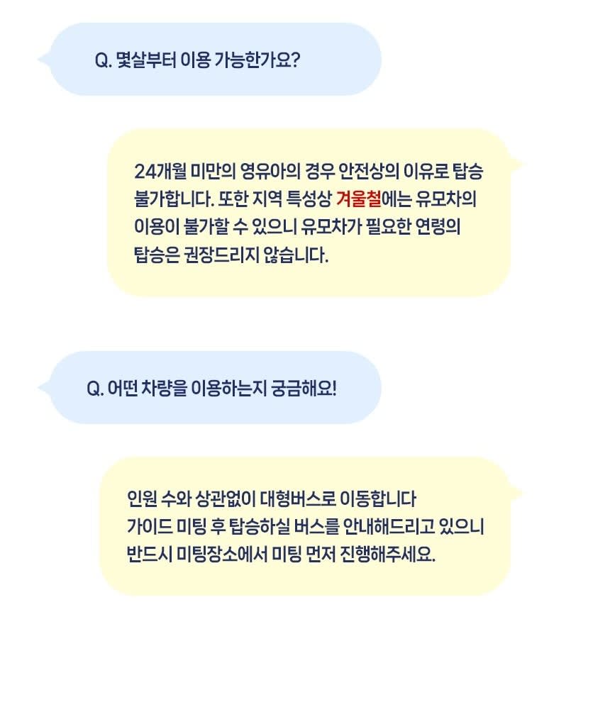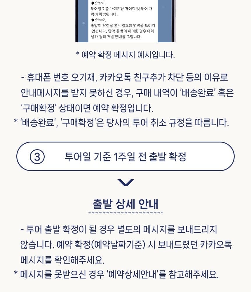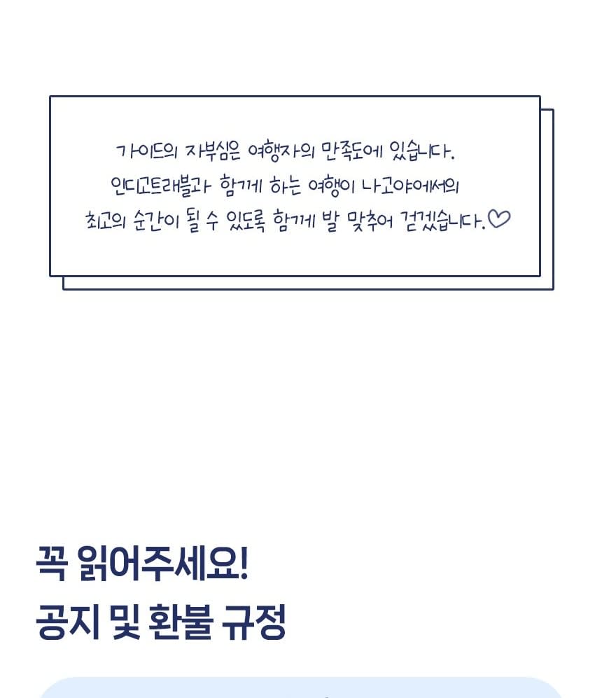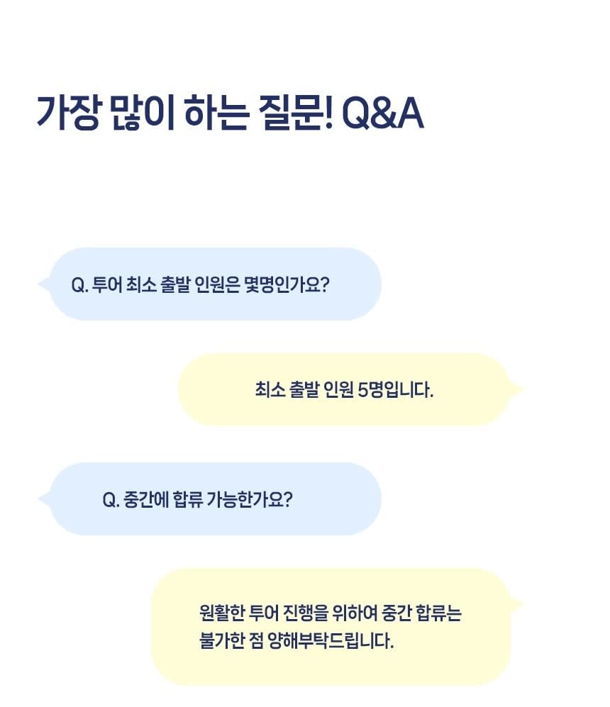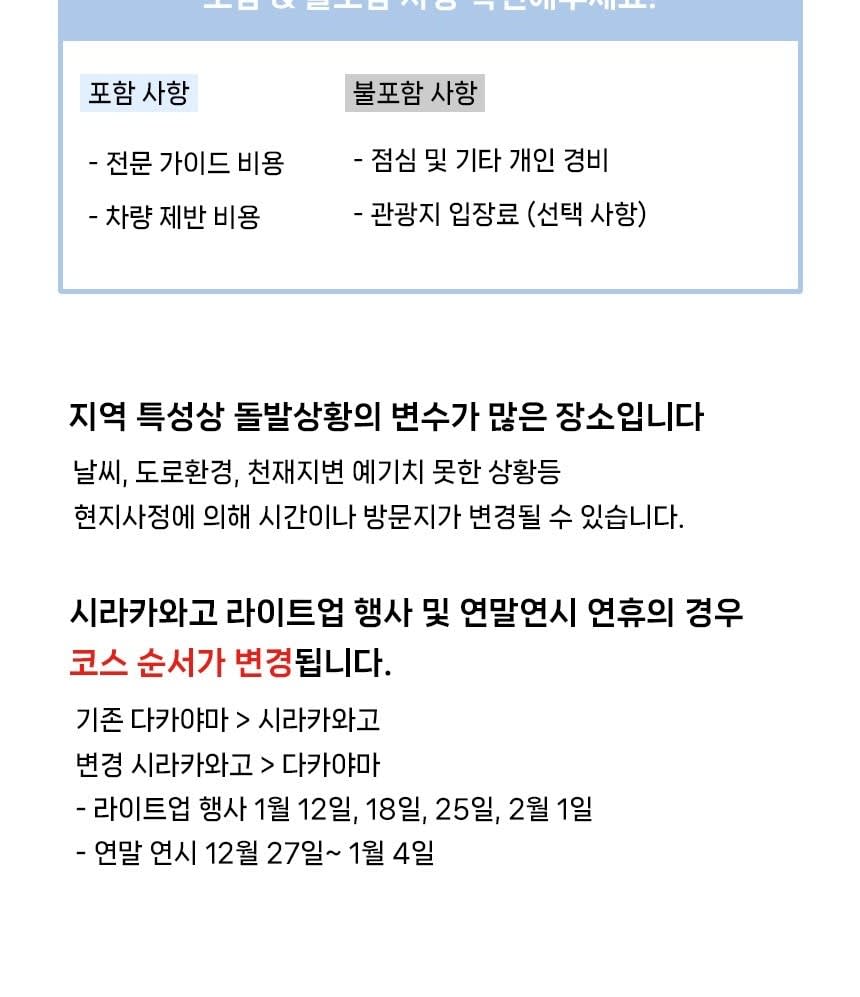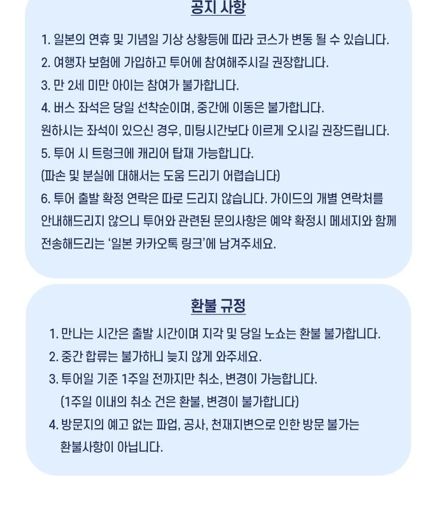- 필수 확인 사항 * ★ 만나는 시간까지, 늦지 않게 나와주시기 바랍니다. 대기 없이 정시 출발입니다. 원활한 투어 진행을 위해 중간합류는 절대 불가하며, 지각시 환불 불가하오니 꼭 늦지않게 미팅장소에 도착하시길 바랍니다. * ★ 투어 전 가이드가 개별 연락을 드리지 않습니다. 많은 분들과 함께하는 단체 투어로, 가이드의 개인 연락처는 전달해드리지 않는 점 양해부탁드리며, 여행확인증을 확인하시어 늦지 않게 나와주세요! * 최소 출발 인원은 5인 입니다. 최소 출발 인원 미달 시 취소될 수 있습니다. 해당 경우에는 투어일 기준 최소 7일 전까지 날짜 변경 제안 또는 전액 환불을 진행합니다 * 여행자 보험 가입 후 여행을 권유합니다. * 일본의 연휴 및 명절, 기상상황에 따라 코스의 변동이 있을 수 있습니다. * 투어 버스에 캐리어 보관이 가능합니다. 귀중품은 잘 챙겨주세요. * 안전하고 원활한 투어 진행을 위해 정해진 시간과 교통법규 등을 준수해주시기 바랍니다.