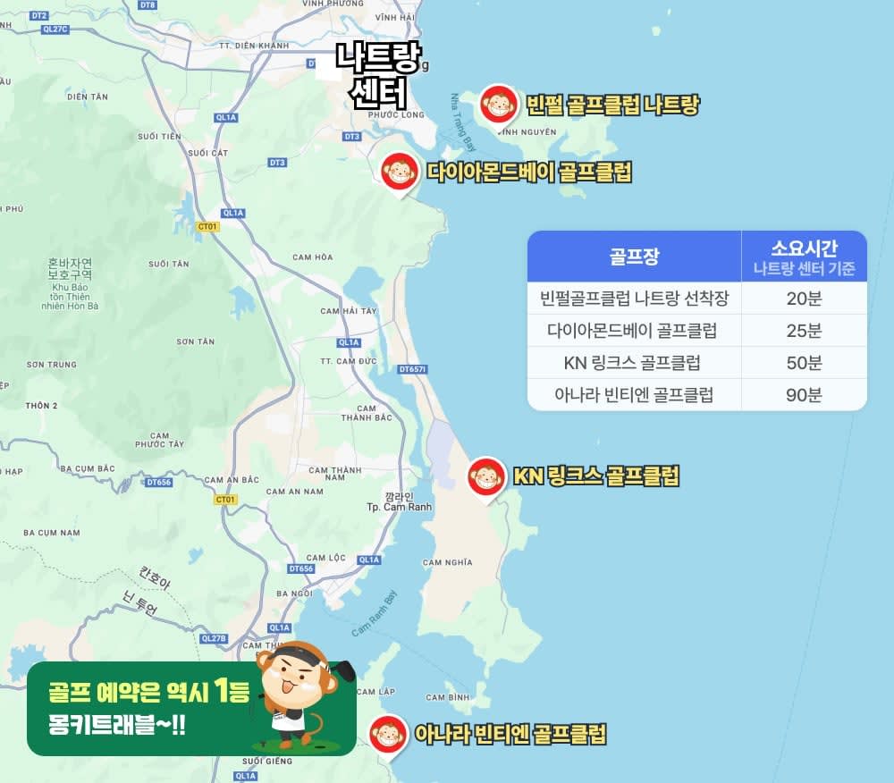 ▶ 체크인 방법 - ⛳ 골프장 체크인 방법 빈펄 선착장 도착해서 클럽하우스 리셉션에서 바우처를 보여주시고 체크인 해주세요. 티오프 30분 전에는 무조건 체크인을 하셔야 합니다. 티오프 30분 전에 체크인을 하지 않는 경우 장시간 대기하거나 라운딩이 불가 할 수 있습니다. - 🚘 기사 미팅 방법 (차량옵션 포함으로 예약시만 적용) 🏨 호텔 미팅 바우처에 있는 Time (픽업시간)시간에 로비에서 고객님 성함 적힌 피켓들고있는 기사님 만나시면됩니다. ✈️ 공항 미팅 - 국제선 미팅장소는 짐찾고 출구 나오셔서 6번기둥입니다. 6번기둥에서 고객님 성함적힌 피켓들고있는 기사님 만나시면되며, 미팅후 기사님과 함께 주차장으로 이동후 차량탑승하셔야 합니다. - 국내선 미팅장소는 건물밖으로 나오셔서 횡단보도건너시면 바로앞에 피켓들고있는 기사님 만나시면됩니다. 🚗차량 이용방법 차량 미팅 시간은 티오프 시간 30분 전 도착하게 설정하여 바우처에 명시해 드립니다. 바우처 받아보시고 시간 맞지 않거나 좀 더 당기기를 원하실 경우 별도 요청해 주세요. 클럽하우스 리셉션에서 바우처 보여주시고 이용해 주세요. 도착 후 기사님 카톡 or 전화번호 받으시고 끝날 때쯤 연락해 주세요. ※ 늦어도 만나기 1시간 전까지 연락 주셔야 제시간에 도착할 수 있어요. 골프장에서 쭉~ 대기하지 않습니다. [카카오채널](https://pf.kakao.com/_wsszxl) - 나트랑 선착장 안내 빈펄 리조트 섬 외부에서 방문하시는 경우에는 티오프 1시간 이전까지는 위, 이미지 장소에 도착하셔야 합니다. 빈펄 나트랑 섬에서 운영하는 스피드보트로, 24시간 운영되며 30분 간격으로 운항합니다. 섬 출발 → 육지 방향 : 00:15 / 00:45 육지 출발 → 섬 방향 : 00:00 / 00:30 ※스피드보트 최대 탑승 인원은 66명입니다.[빈펄 선착장 구글맵 바로가기](https://maps.app.goo.gl/RgHqz2bQGE5MqPM49)